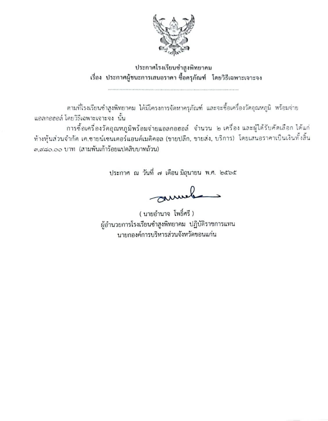 ประกาศโรงเรียนชำสูงพิทยาคม เรื่อง ประกาศผู้ชนะการเสนอราคา ซื้อครุภัณฑ์ โดยวิธีเฉพาะเจาะจง