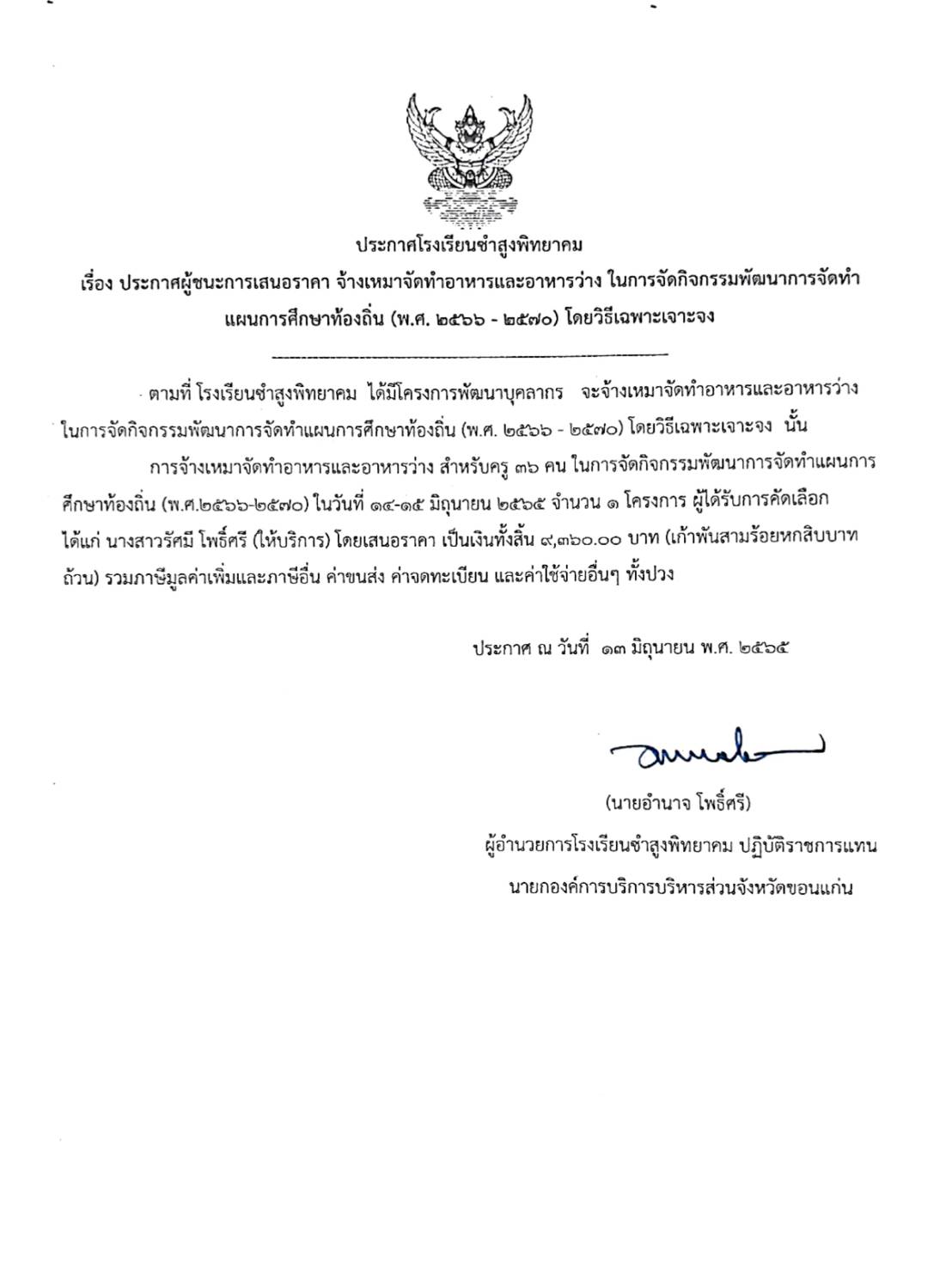 ประกาศโรงเรียนซำสูงพิทยาคม เรื่อง ประกาศผู้ชนะการเสนอราคา จ้างเหมาจัดทำอาหารและอาหารว่าง ในการจัดกิจกรรมพัฒนาการจัดทำ แผนการศึกษาท้องถิ่น (พ.ศ. ๒๕๖๖ - ๒๕๗อ) โดยวิธีเฉพาะเจาะจง