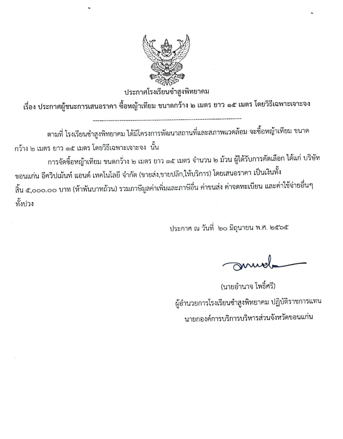 ประกาศโรงเรียนชำสูงพิทยาคม เรื่อง ประกาศผู้ชนะการเสนอราคา ซื้อหญ้าเทียม ขนาดกว้าง ๒ เมตร ยาว ๑๕ เมตร โดยวิธีเฉพาะเจาะจง