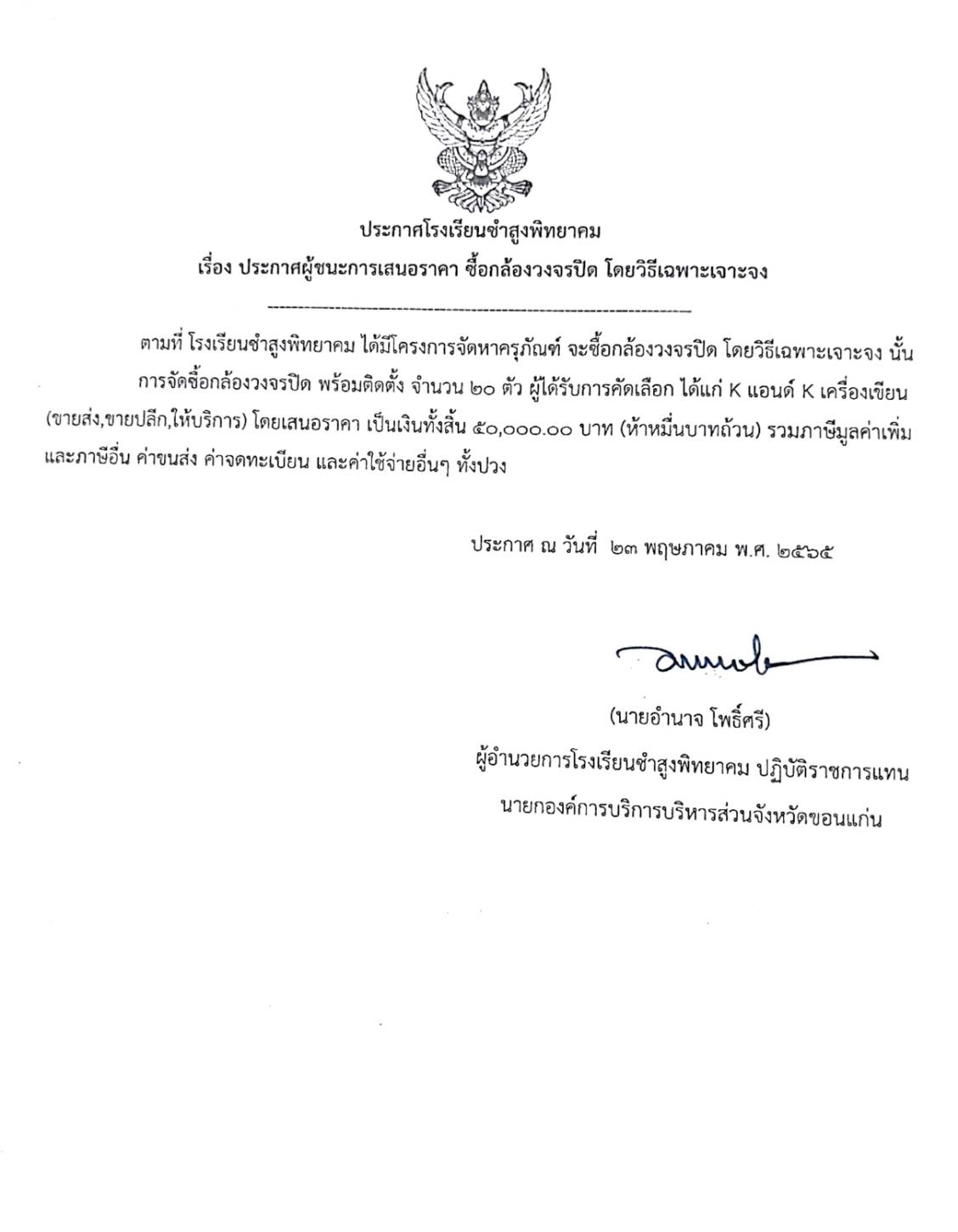 ประกาศโรงเรียนชำสูงพิทยาคม เรื่อง ประกาศผู้ชนะการเสนอราคา ซื้อกล้องวงจรปิด โดยวิธีเฉพาะเจาะจง