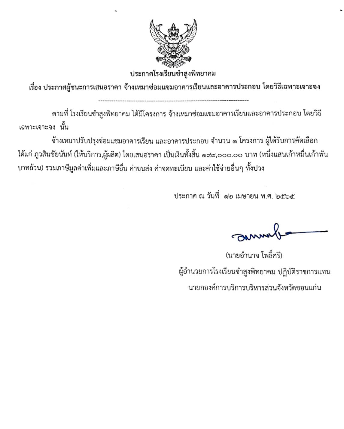 ประกาศโรงเรียนชำสูงพิทยาคม เรื่อง ประกาศผู้ชนะการเสนอราคา จ้างเหมาซ่อมแซมอาคารเรียนและอาคารประกอบ โดยวิธีเฉพาะเจาะจง
