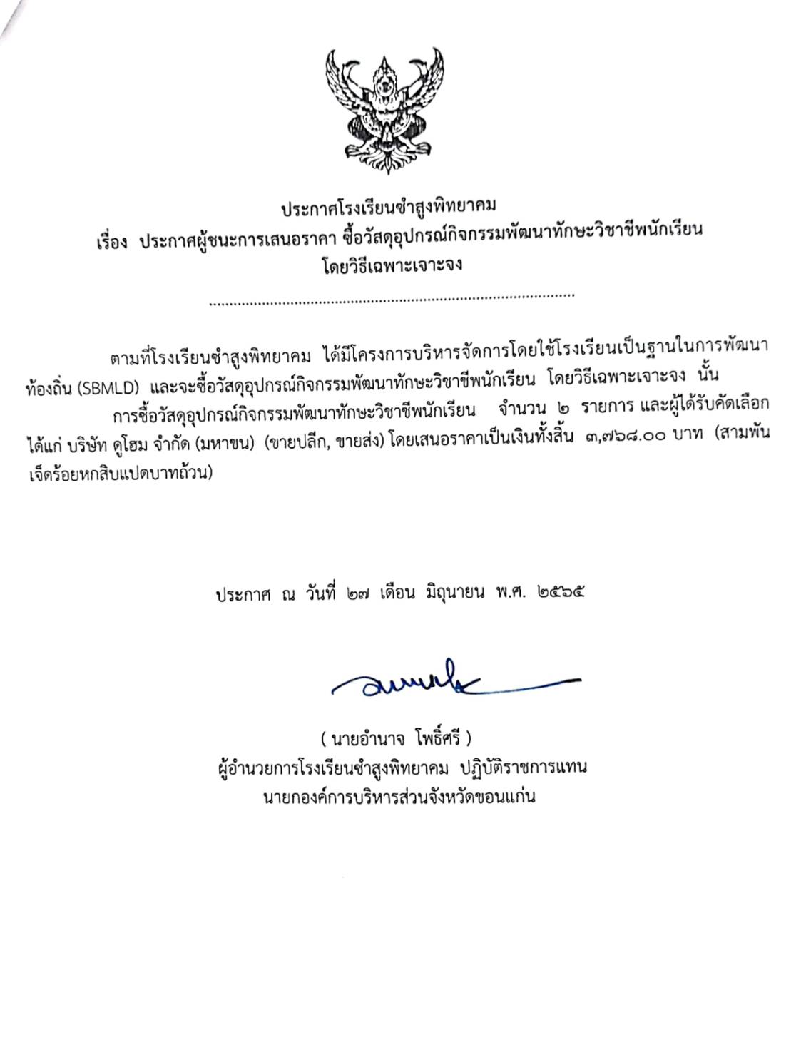 ประกาศโรงเรียนยำสูงพิทยาคม เรื่อง ประกาศผู้ชนะการเสนอราคา ซื้อวัสดุอุปกรณ์กิจกรรมพัฒนาทักษะวิซาชีพนักเรียน โดยวิธีเฉพาะเจาะจง