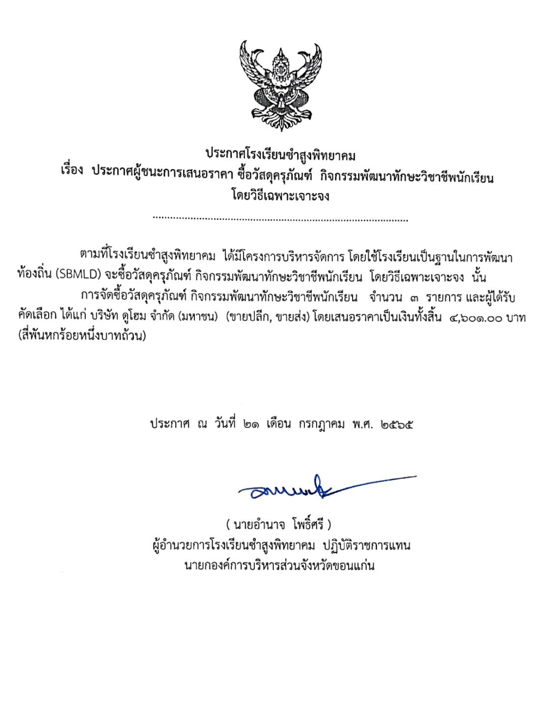 ประกาศโรงเรียนซำสูงพิทยาคม เรื่อง ประกาศผู้ชนะการเสนอราคา ซื้อวัสดุครุภัณฑ์ กิจกรรมพัฒนาทักษะวิชาชีพนักเรียน โดยวิธีเฉพาะเจาะจง