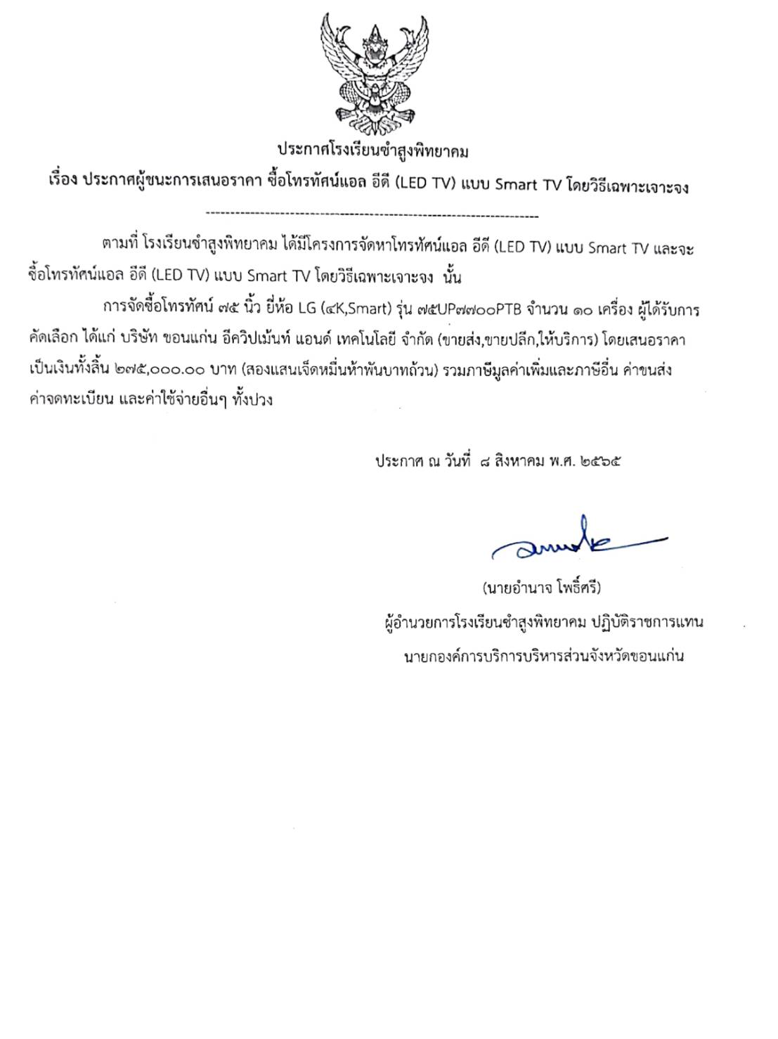 ประกาศโรงเรียนชำสูงพิทยาคม เรื่อง ประกาศผู้ชนะการเสนอราคา ซื้อโทรทัศน์แอล อีดี (LED TV) แบบ Smart TV โดยวิธีเฉพาะเจาะจง