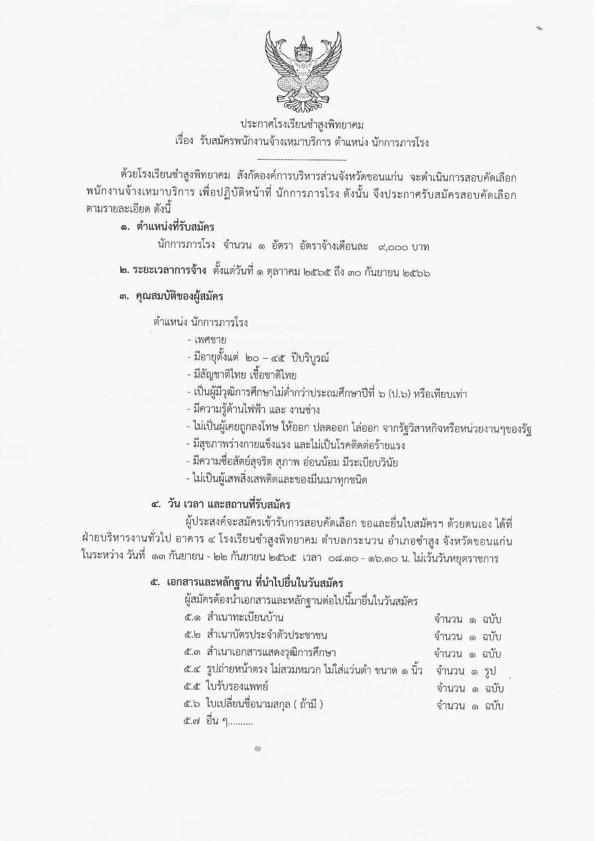 ประกาศโรงเรียนซำสูงพิทยาคม เรื่อง รับสมัครพนักงานจ้างเหมาบริการ ตำแหน่ง นักการภารโรง