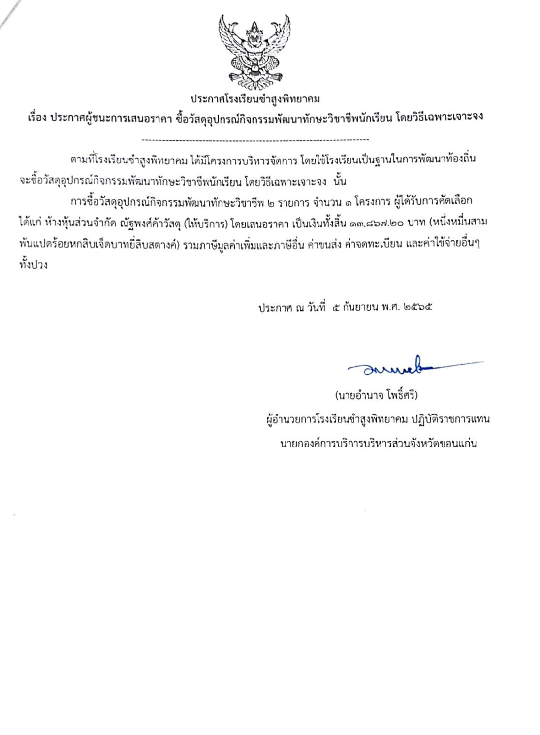 ประกาศโรงเรียนซำสูงพิทยาคม เรื่อง ประกาศผู้ชนะการเสนอราคา ซื้อวัสดุอุปกรณ์กิจกรรมพัฒนาทักษะวิชาชีพนักเรียน โดยวิธีเฉพาะเจาะจง