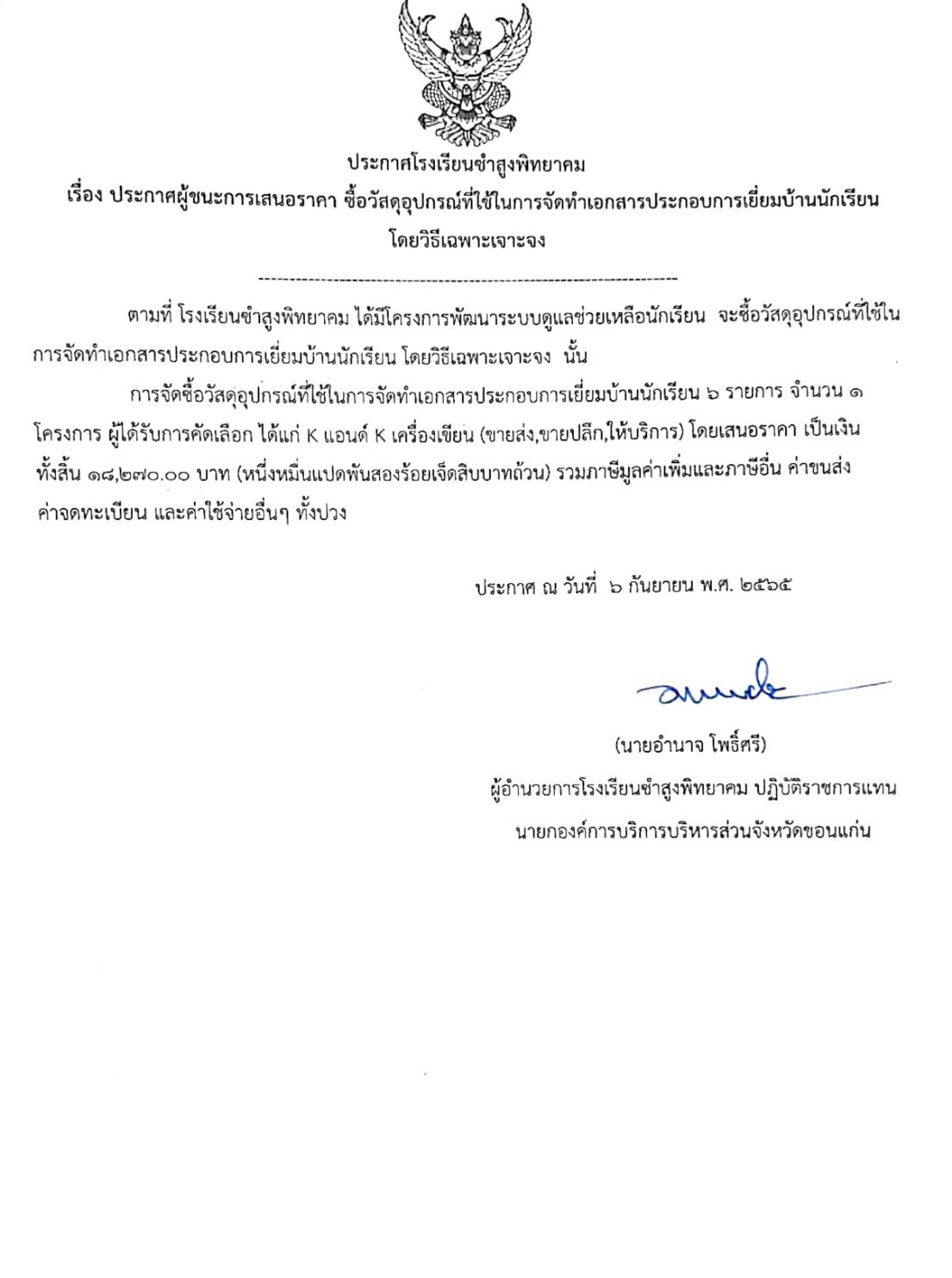 ประกาศโรงเรียนซำสูงพิทยาคม เรื่อง ประกาศผู้ชนะการเสนอราคา ซื้อวัสดุอุปกรณ์ที่ใช้ในการจัดทำเอกสารประกอบการเยี่ยมบ้านนักเรียน โดยวิธีเฉพาะเจาะจง