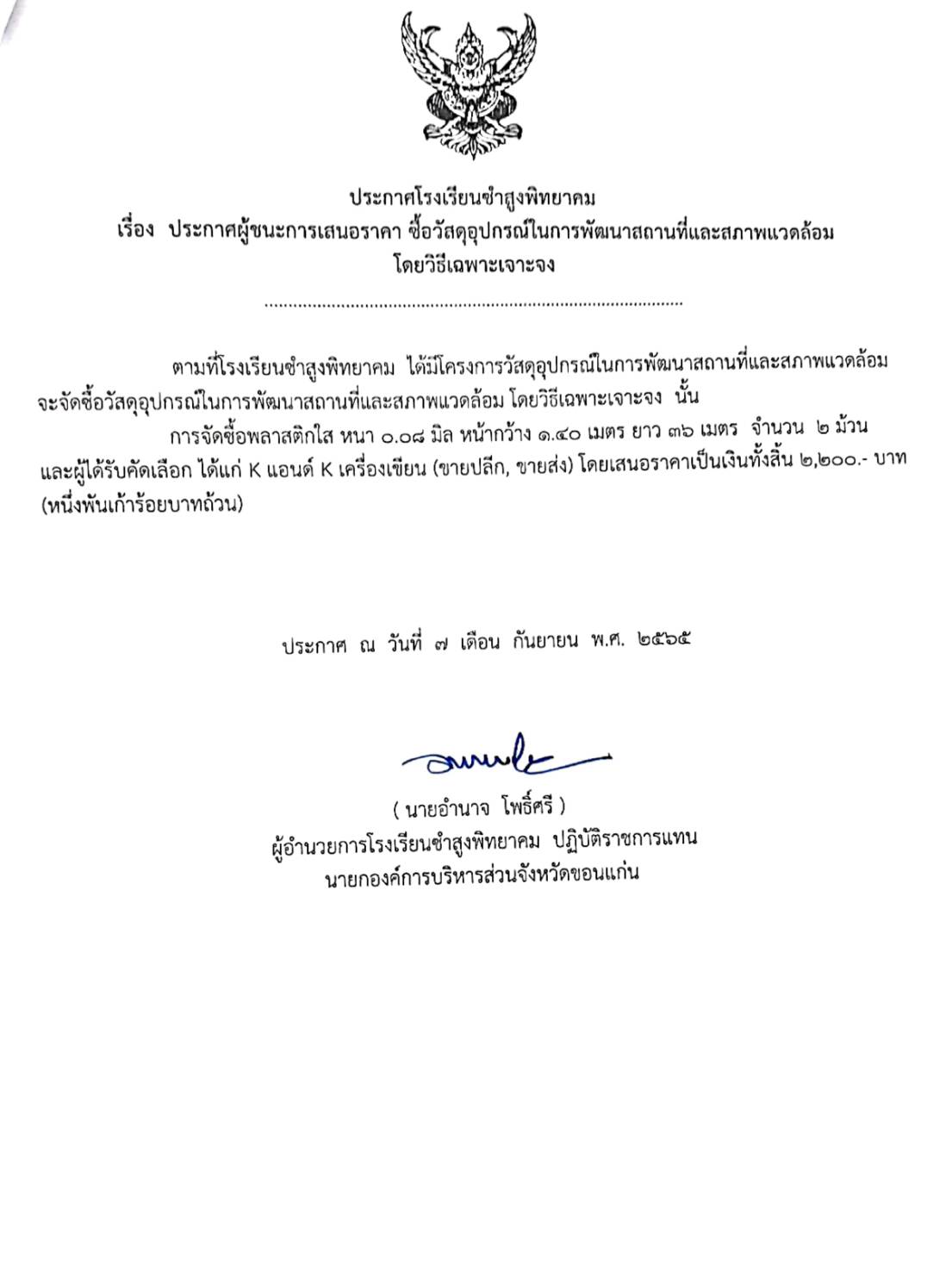 ประกาศโรงเรียนซำสูงพิทยาคม เรื่อง ประกาศผู้ชนะการเสนอราคา ซื้อวัสดอุปกรณ์ในการพัฒนาสถานที่และสภาพแวดล้อม โดยวิธีเฉพาะเจาะจง