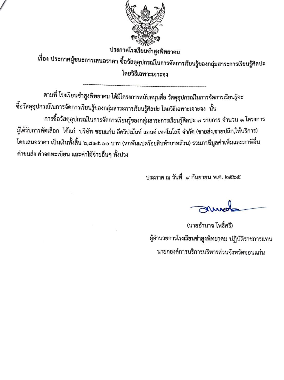 ประกาศโรงเรียนชำสูงพิทยาคม เรื่อง ประกาศผู้ชนะการเสนอราคา ซื้อวัสดุอุปกรณ์ในการจัดการเรียนรู้ของกลุ่มสาระการเรียนรู้ศิลปะ โดยวิธีเฉพาะเจาะจง