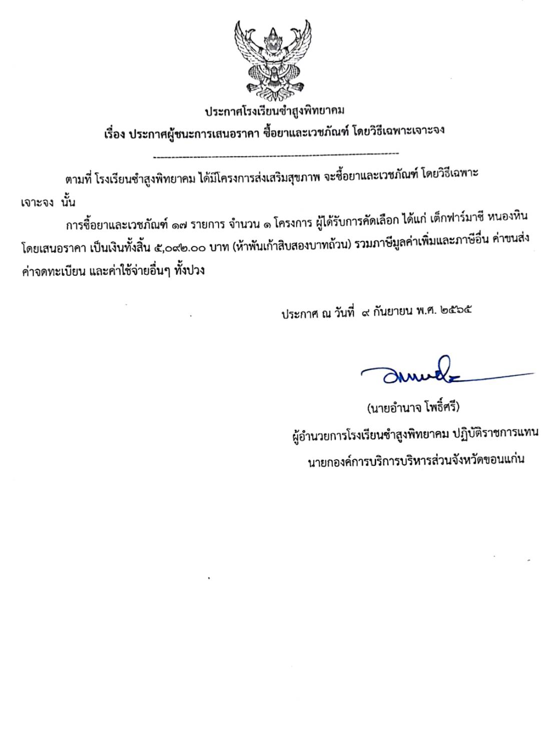ประกาศโรงเรียนชำสูงพิทยาคม เรื่อง ประกาศผู้ชนะการเสนอราคา ซื้อยาและเวชภัณฑ์ โดยวิธีเฉพาะเจาะจง