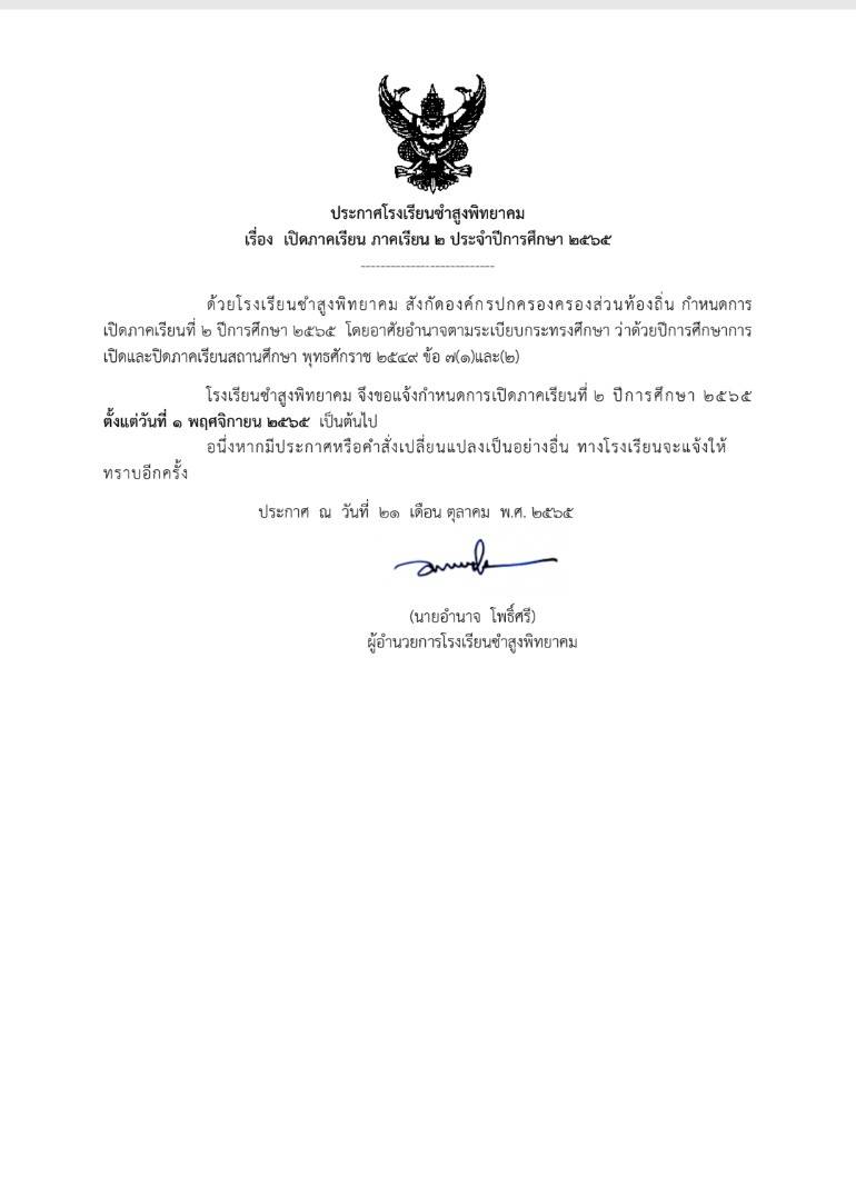 ประกาศโรงเรียนชำสูงพิทยาคม เรื่อง เปิดภาคเรียน ภาคเรียน ๒ ประจำปีการศึกษา ๒๕๖๕