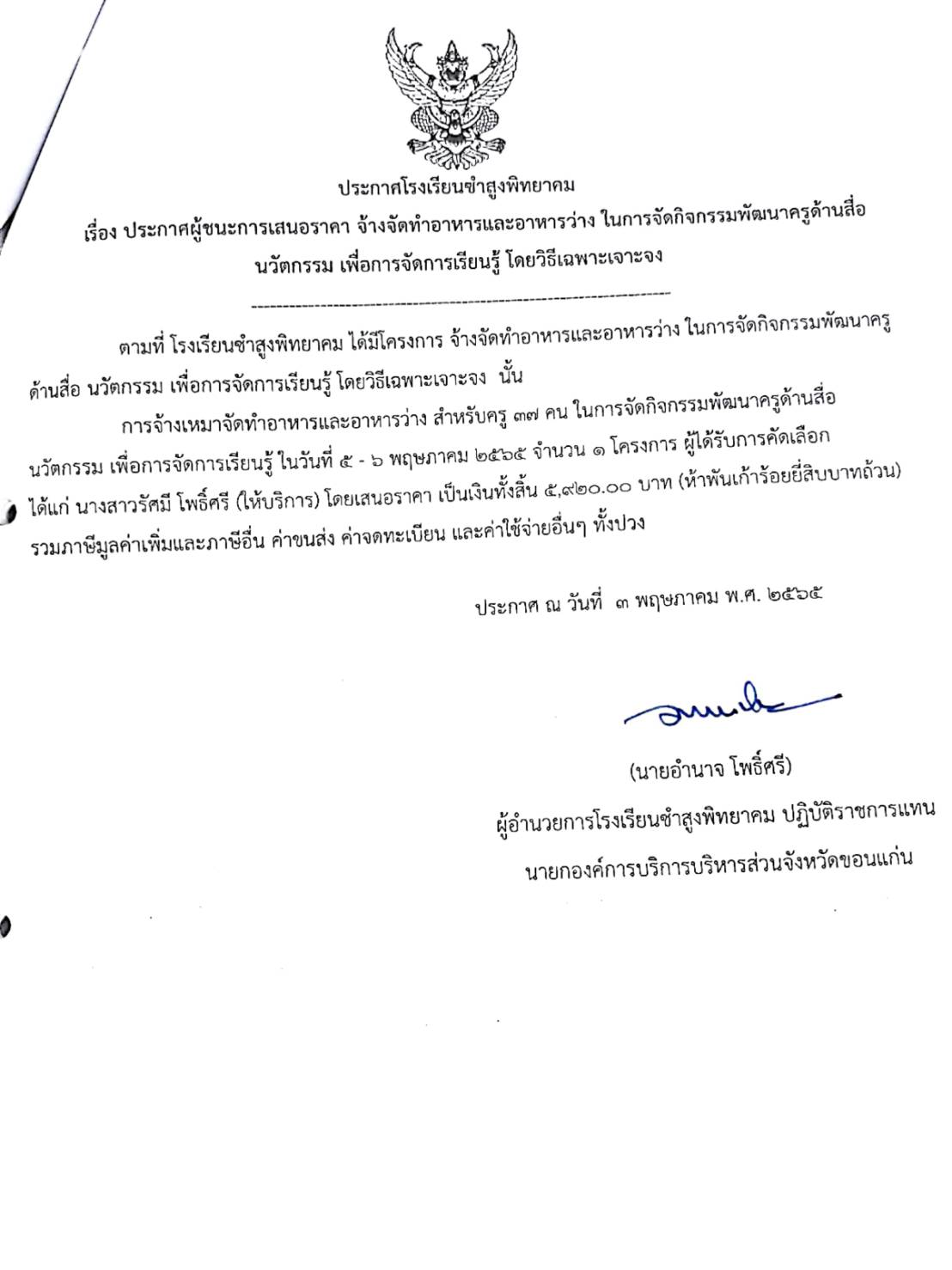 ประกาศโรงเรียนขำสูงพิทยาคม เรื่อง ประกาศผู้ชนะการเสนอราคา จ้างจัดทำอาหารและอาหารว่าง ในการจัดกิจกรรมพัฒนาครูด้านสื่อ นวัตกรรม เพื่อการจัดการเรียนรู้ โดยวิธีเฉพาะเจาะจง