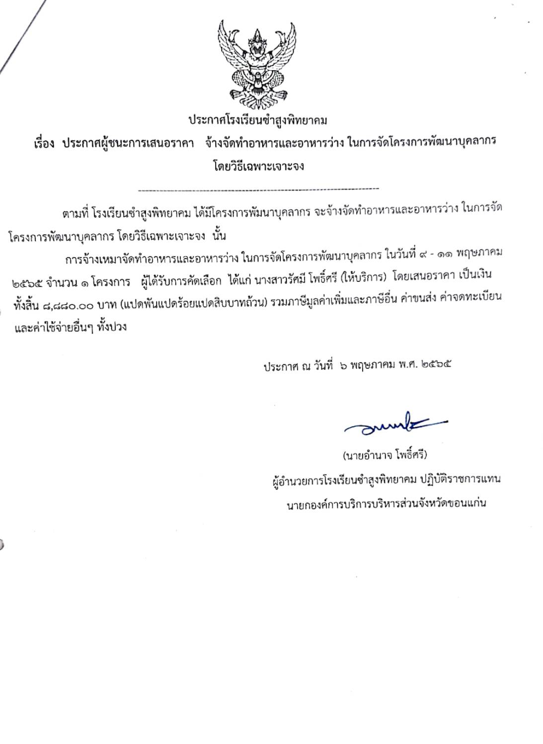ประกาศโรงเรียนชำสูงพิทยาคม เรื่อง ประกาศผู้ชนะการเสนอราคา จ้างจัดทำอาหารและอาหารว่าง ในการจัดโครงการพัฒนาบุคลากร โดยวิธีเฉพาะเจาะจง