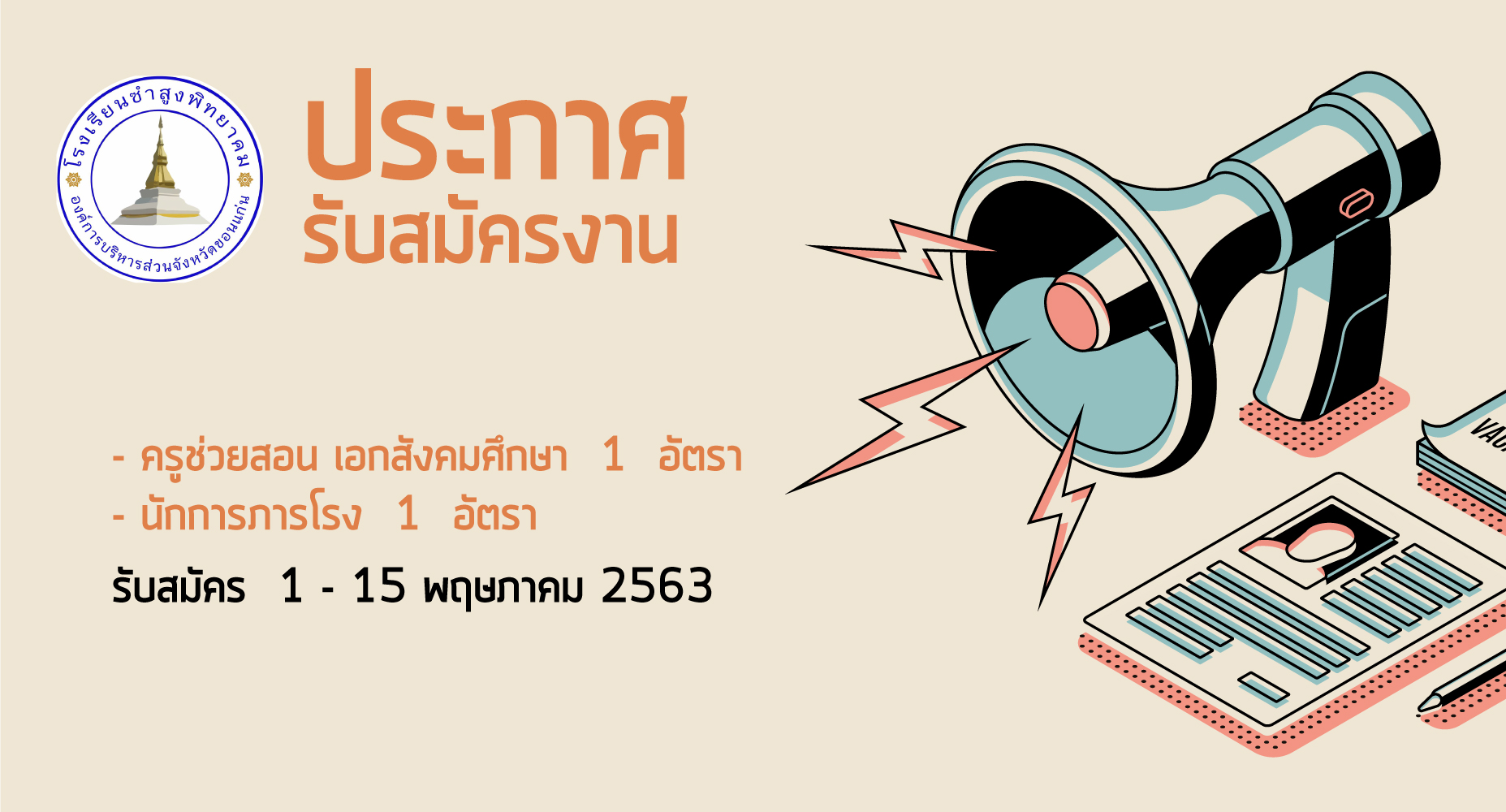 รับสมัครพนักงานจ้างเหมาบริการ ตำแหน่ง ครูช่วยสอนเอกสังคมศึกษา และนักการภารโรง