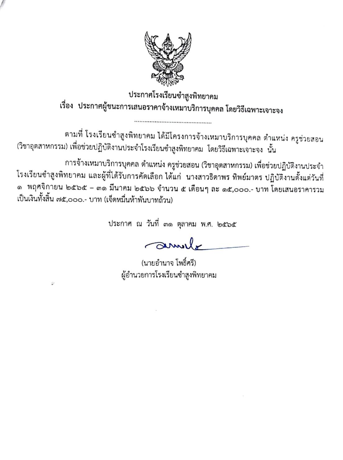 ประกาศโรงเรียนซำสูงพิทยาคม เรื่อง ประกาศผู้ชนะการเสนอราคาจ้างเหมาบริการบุคคล โดยวิธีเฉพาะเจาะจง