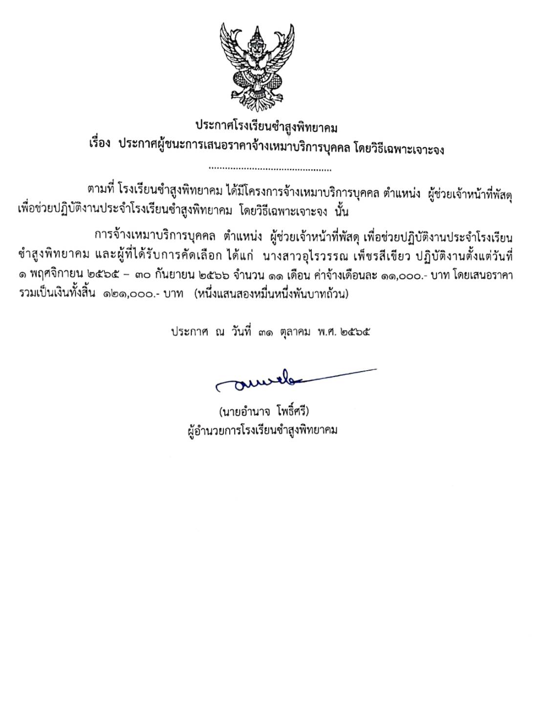 ประกาศโรงเรียนชำสูงพิทยาคม เรื่อง ประกาศผู้ชนะการเสนอราคาจ้างเหมาบริการบุคคล โดยวิธีเฉพาะเจาะจง