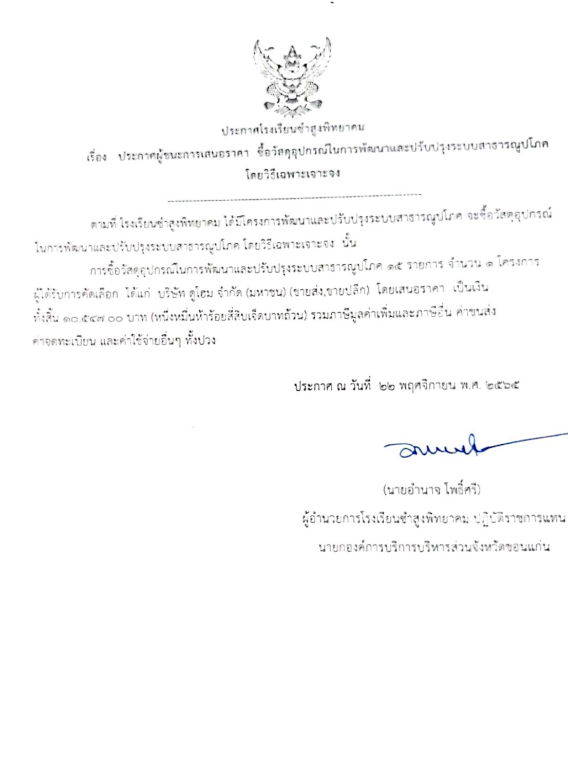 ประกาศโรงเรียนชำสูงพืทยาคม เรื่อง ประกาศผู้ชนะการเสนอราคา ชื้อวัสดุอุปกรณ์ในการพัฒนาและปรับบำรุงระบบสาธารณูปโภค โดยวิธีเฉพาะเจาะจง