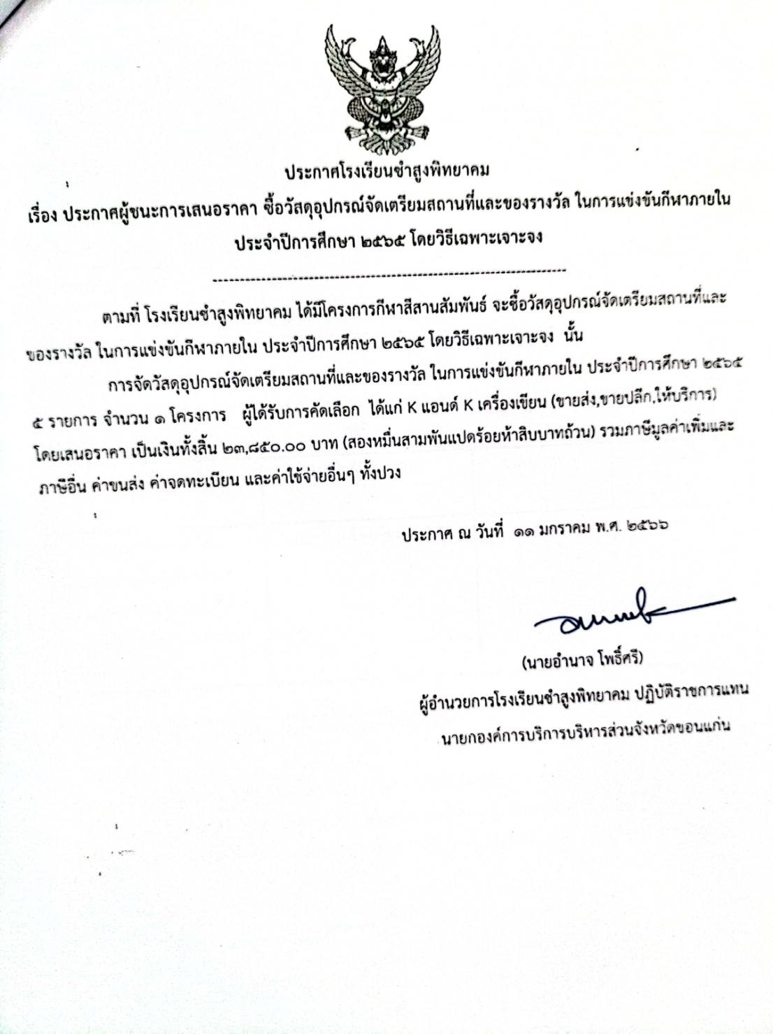 ประกาศโรงเรียนซำสูงพิทยาคม เรื่อง ประกาศผู้ชนะการเสนอราคา ซื้อวัสดุอุปกรณ์จัดเตรียมสถานที่และของรางวัล ในการแข่งชันกีหากายใน ประจำปีการศึกษา ๒๕๖๕ โดยวิธีเฉพาะเจาะจง