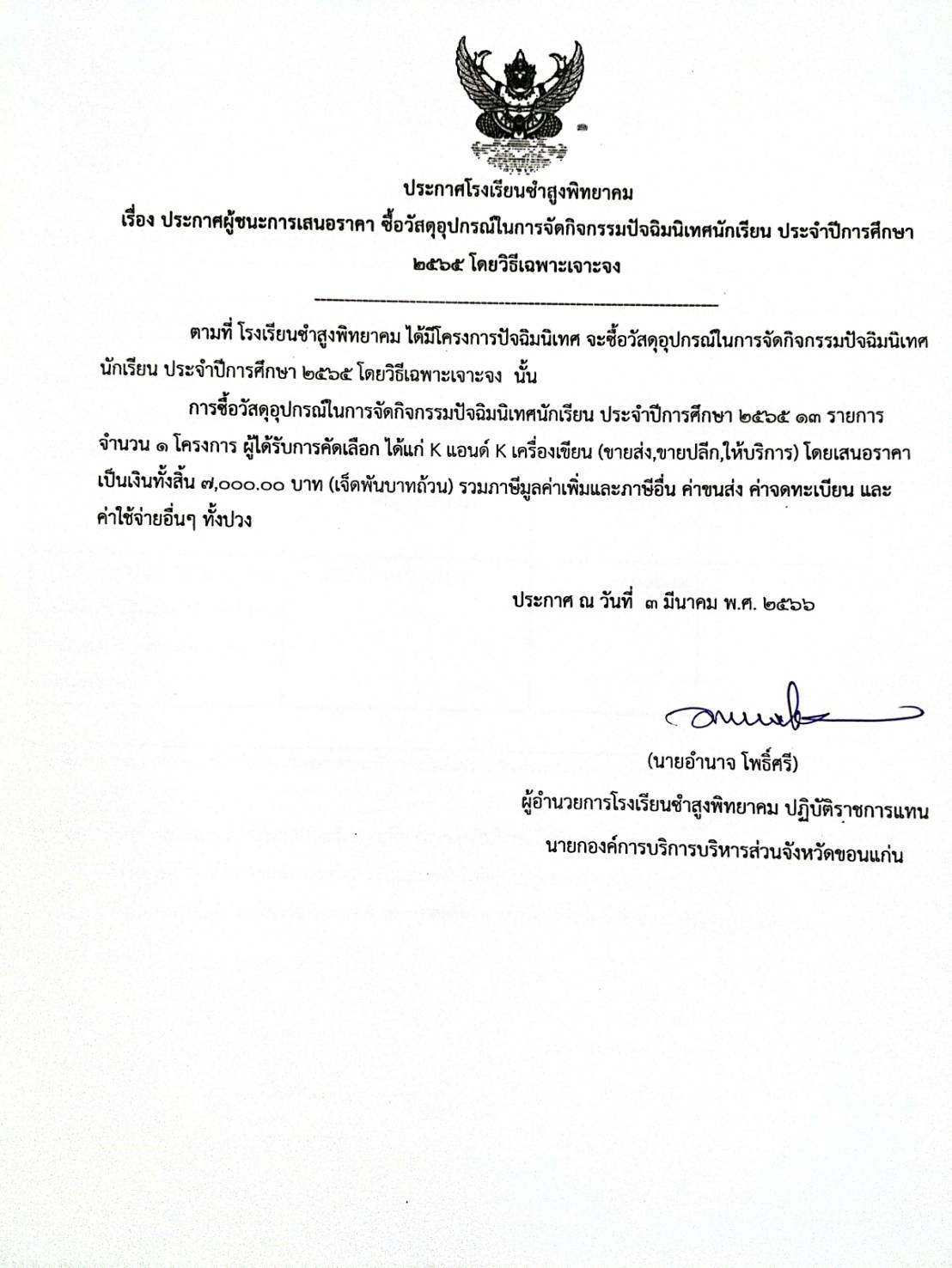 ประกาศโรงเรียนซำสูงพิทยาคม เรื่อง ประกาศผู้ชนะการเสนอราคา ซื้อวัสดุอุปกรณ์ในการจัดกิจกรรมปัจฉิมนิเทศนักเรียน ประจำปีการศึกษา ๒๕๖๕ โดยวิธีเฉพาะเจาะจง