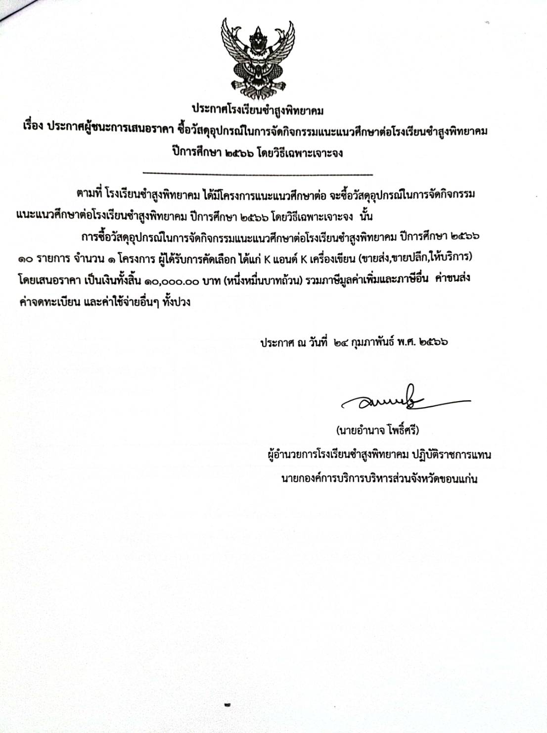 ประกาศโรงเรียนชำสูงพิทยาคม เรื่อง ประกาศผู้ชนะการเสนอราคา ซื้อวัสดุอุปกรณ์นการจัดกิจกรรมแนะแนวศึกษาต่อโรงเรียนชำสูงพิทยาคม ปีการศึกษา ๒๕๖๖ โดยวิธีเฉพาะเจาะจง