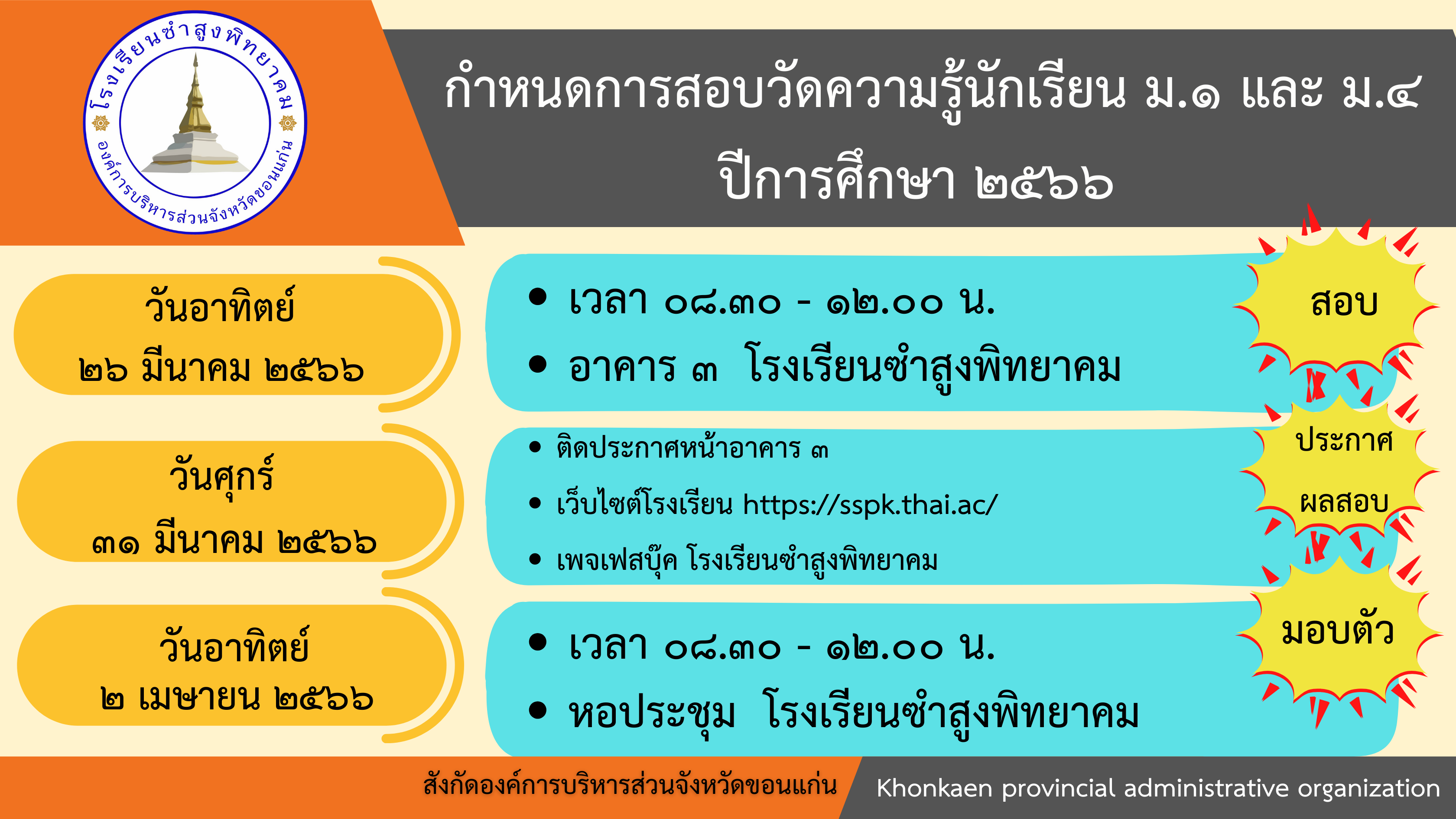 กำหนดการสอบวัดความรู้นักเรียน ม. 1 และม.4 ปีการศึกษา 2566