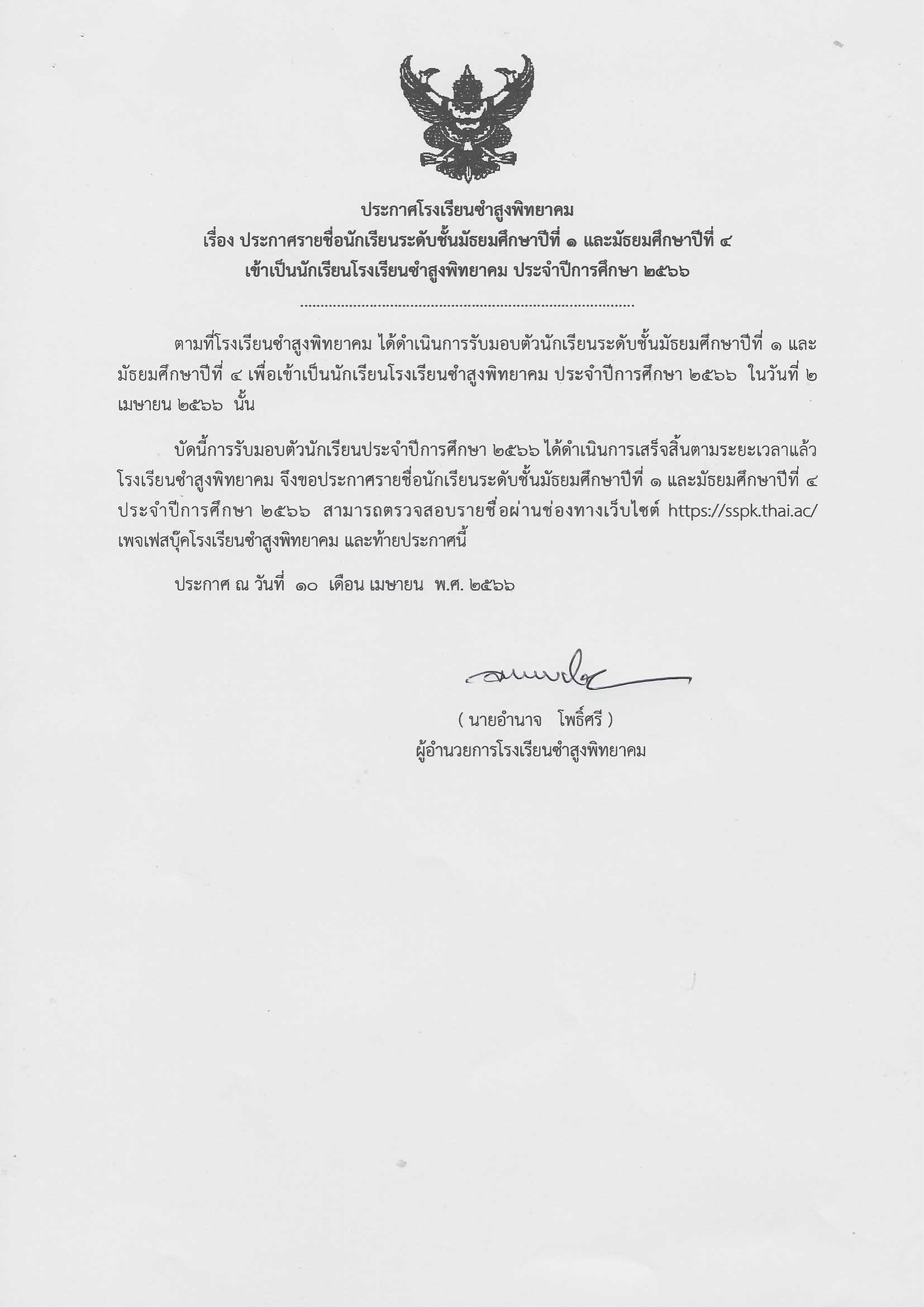 ประกาศโรงเรียนซำสูงพิทยาคม เรื่อง ประกาศรายชื่อนักเรียนระดับชั้นมัธยมศึกษาปีที่ ๑ และมัธยมศึกษาปีที่ ๔ ปีการศึกษา ๒๕๖๖