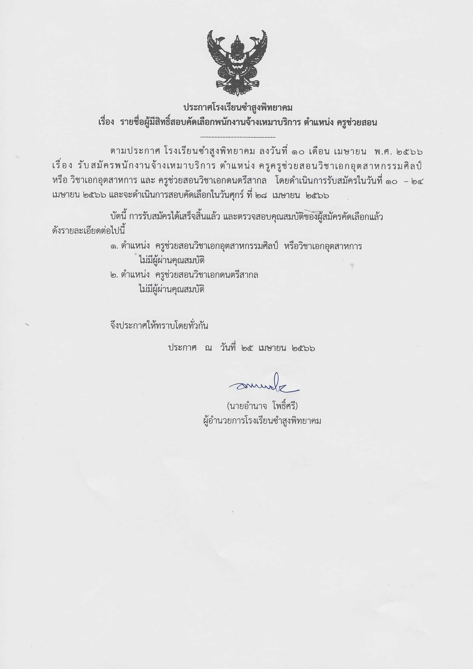 ประกาศโรงเรียนซำสูงพิทยาคมเรื่องรายชื่อผู้มีสิทธิ์สอบคัดเลือกพนักงานจ้างเหมาบริการตำแหน่งครูช่วยสอน