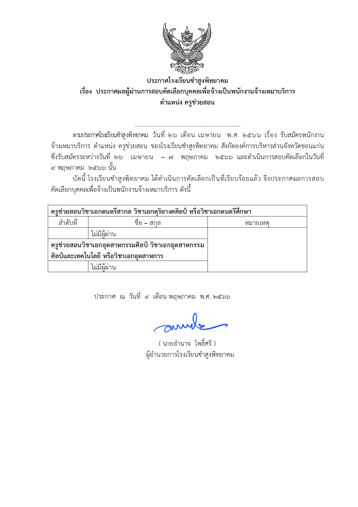 ประกาศโรงเรียนซำสูงพิทยาคม เรื่อง ประกาศผลผู้ผ่านการสอบคัดเลือกบุคคลเพื่อจ้างเป็นพนักงานจ้างเหมาบริการ ตำแหน่ง ครูช่วยสอน