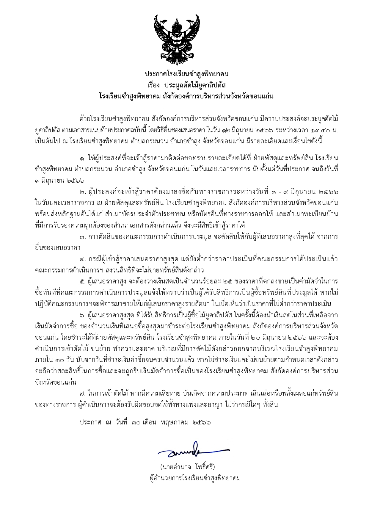 ประกาศโรงเรียนซำสูงพิทยาคม เรื่อง ประมูลตัดไม้ยูคาลิปตัส โรงเรียนชำสูงพิทยาคม สังกัดองค์การบริหารส่วนจังหวัดขอนแก่น