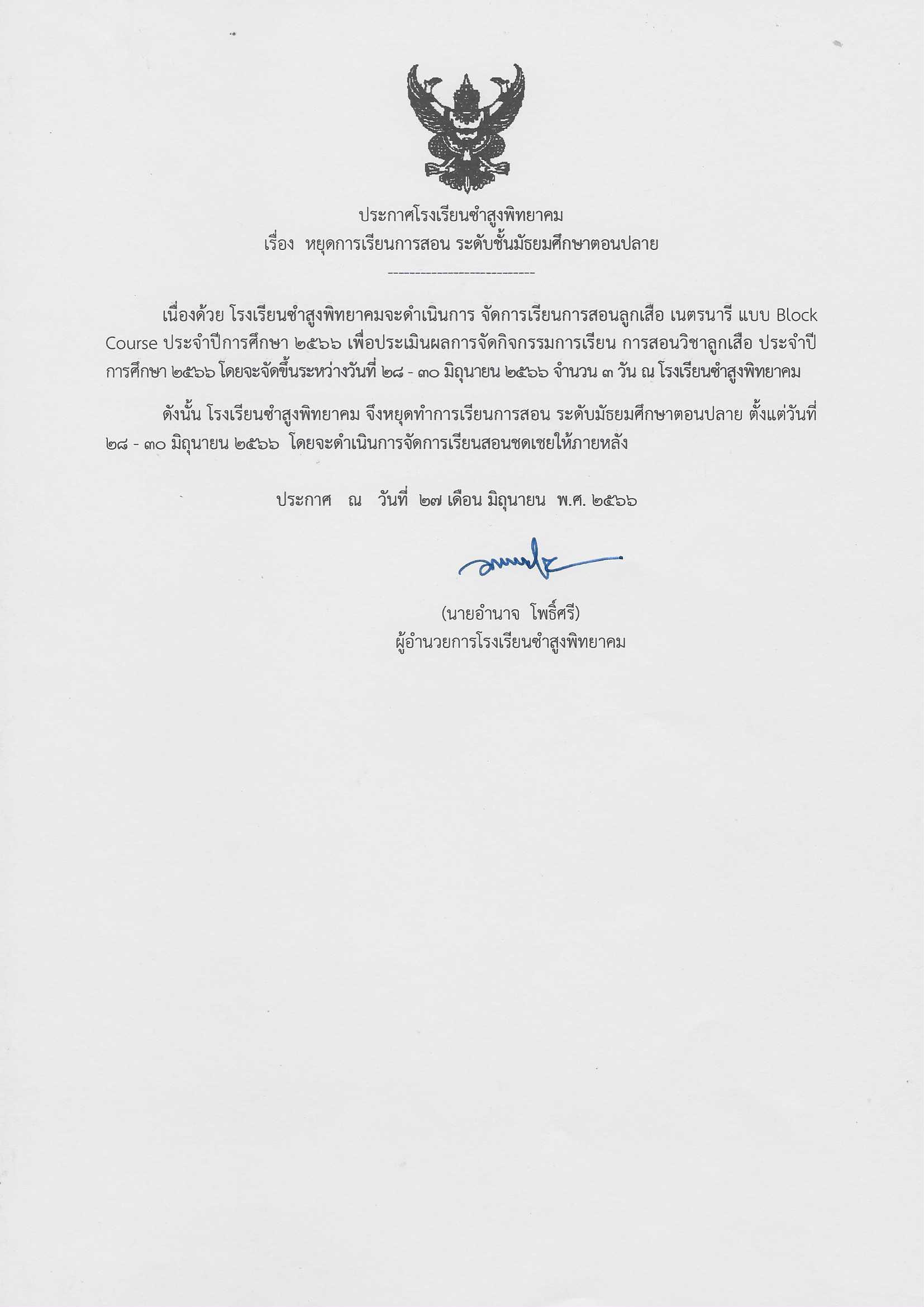 ประกาศโรงเรียนซำสูงพิทยาคม เรื่อง หยุดการเรียนการสอน ระดับชั้นมัธยมศึกษาตอนปลาย