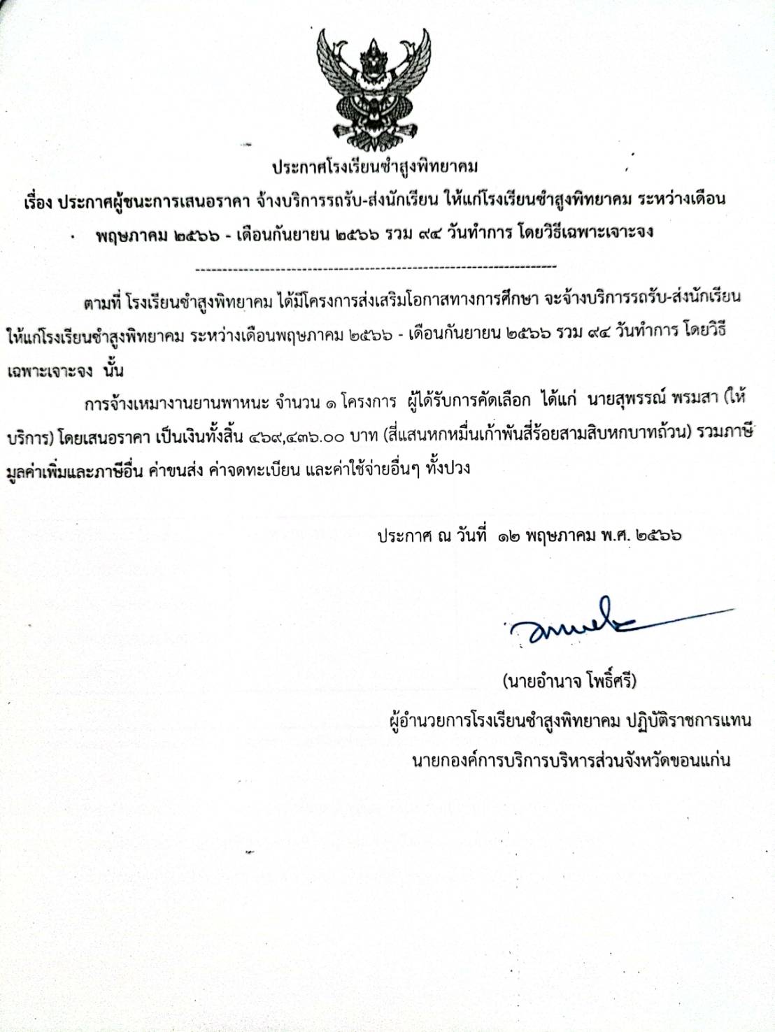 ประกาศโรงเรียนซำสูงพิทยาคม เรื่อง ประกาศผู้ขนะการเสนอราคา จ้างบริการรถรับ-ส่งนักเรียน ให้แก่โรงเรียนชำสูงพิทยาคม ระหว่างเดือน พฤษภาคม ๒๕๖๖ - เดือนกันยายน ๒๕๖๖ รวม ๙๔ วันทำการ โดยวิธีเฉพาะเจาะจง