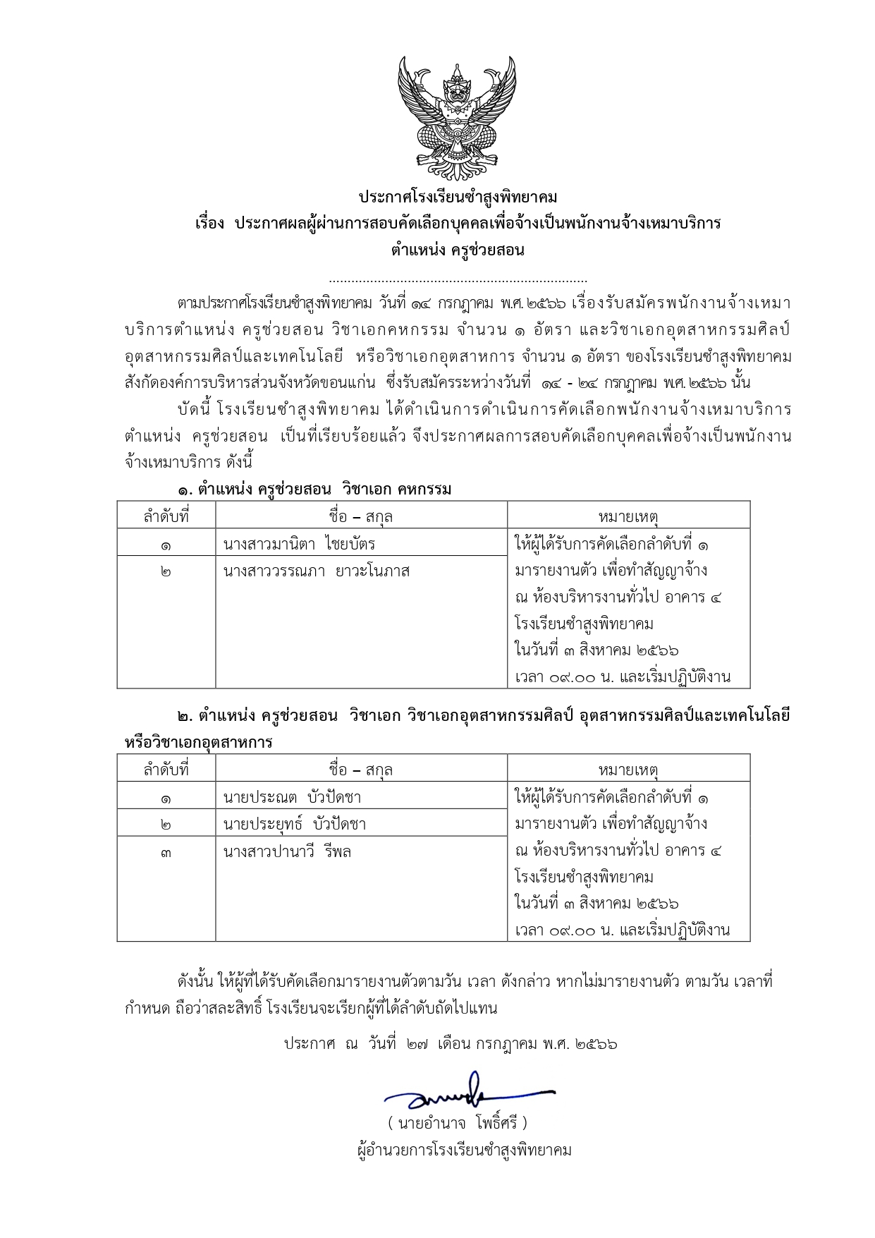 ประกาศโรงเรียนซำสูงพิทยาคม เรื่อง ประกาศผลผู้ผ่านการสอบคัดเลือกบุคคลเพื่อจ้างเป็นพนักงานจ้างเหมาบริการ ตำแหน่ง ครูช่วยสอน