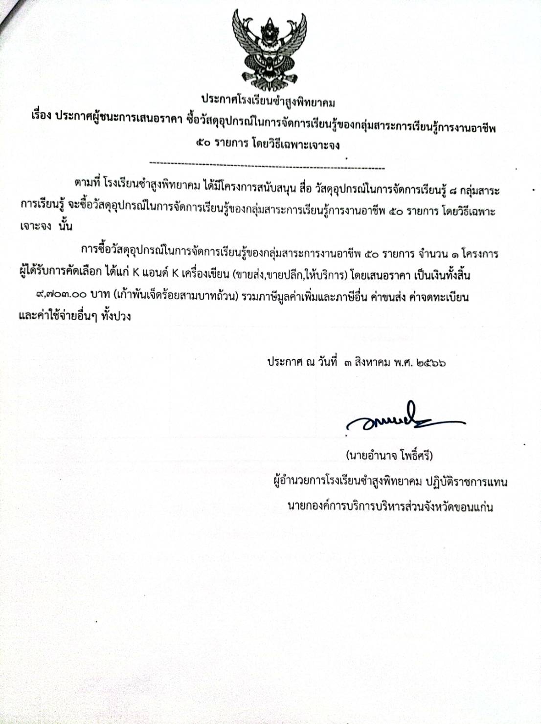 ประกาศโรงเรียนชำสูงพิทยาคม เรื่อง ประกาศผู้ชนะการเสนอราคา ซื้อวัสดุอุปกรณ์ในการจัดการเรียนรู้ของกลุ่มสาระการเรียนรู้การงานอาชีพ 50 รายการ โดยวิธีเฉพาะเจาะจง