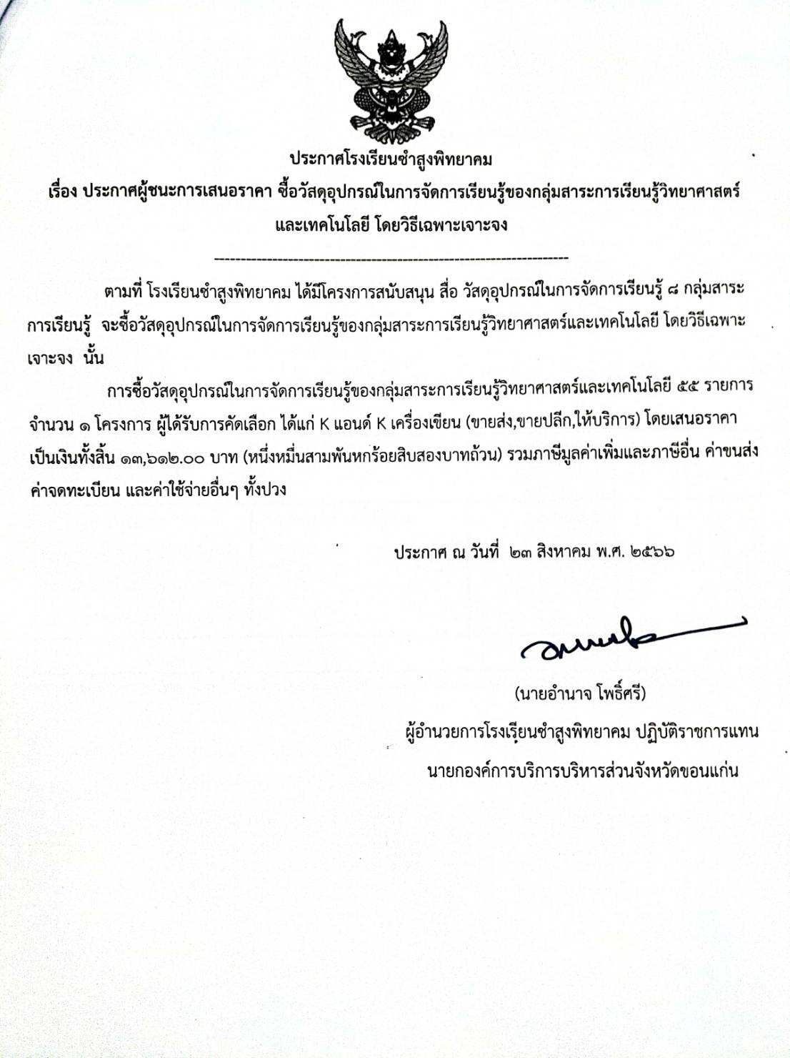 ประกาศโรงเรียนซำสูงพิทยาคม เรื่อง ประกาศผู้ชนะการเสนอราคา ซื้อวัสดุอุปกรณ์ในการจัดการเรียนรู้ของกลุ่มสาระการเรียนรู้วิทยาศาสตร์ และเทคโนโลยี โดยวิธีเฉพาะเจาะจง