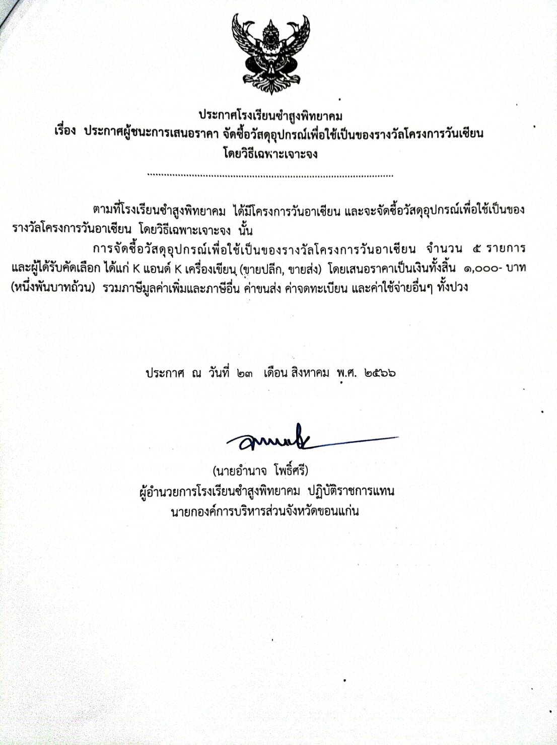 ประกาศโรงเรียนชำสูงพิทยาคม เรื่อง ประกาศผู้ชนะการเสนอราคา จัดซื้อวัสดุอุปกรณ์เพื่อใช้เป็นของรางวัลโครงการวันเซียน โดยวิธีเฉหาะเจาะจง