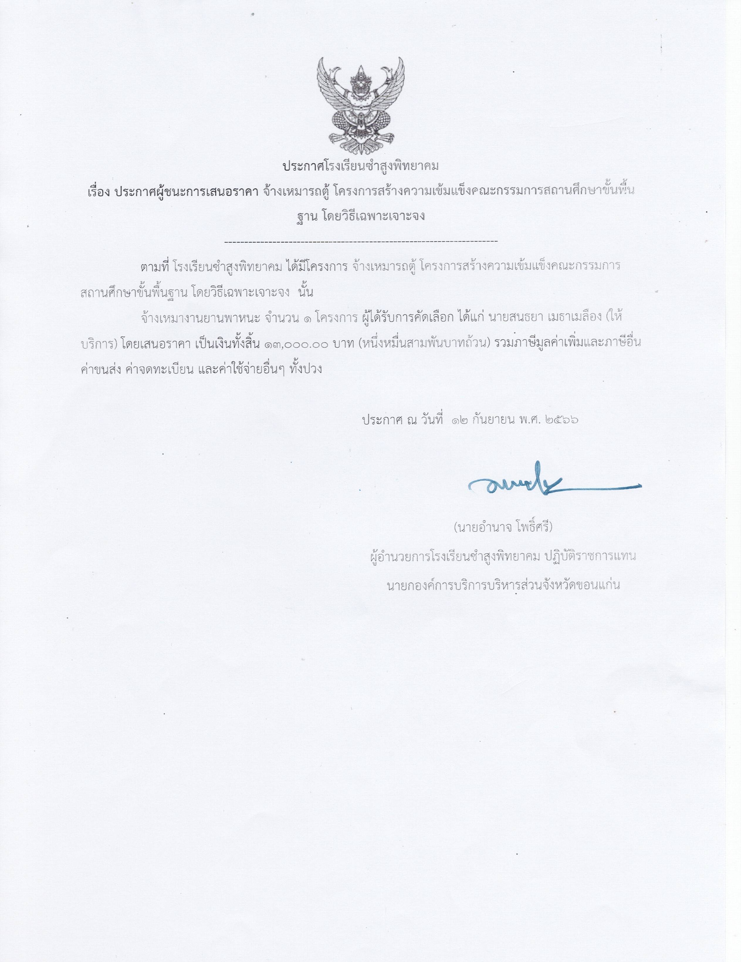 ประกาศโรงเรียนซำสูงพิทยาคมเรื่องประกาศผู้ชนะการเสนอราคาจ้างเหมารถตู้โครงการสร้างความเข้มแข็งคณะกรรมการสถานศึกษาขั้นพื้นฐานโดยวิธีเฉพาะเจาะจง