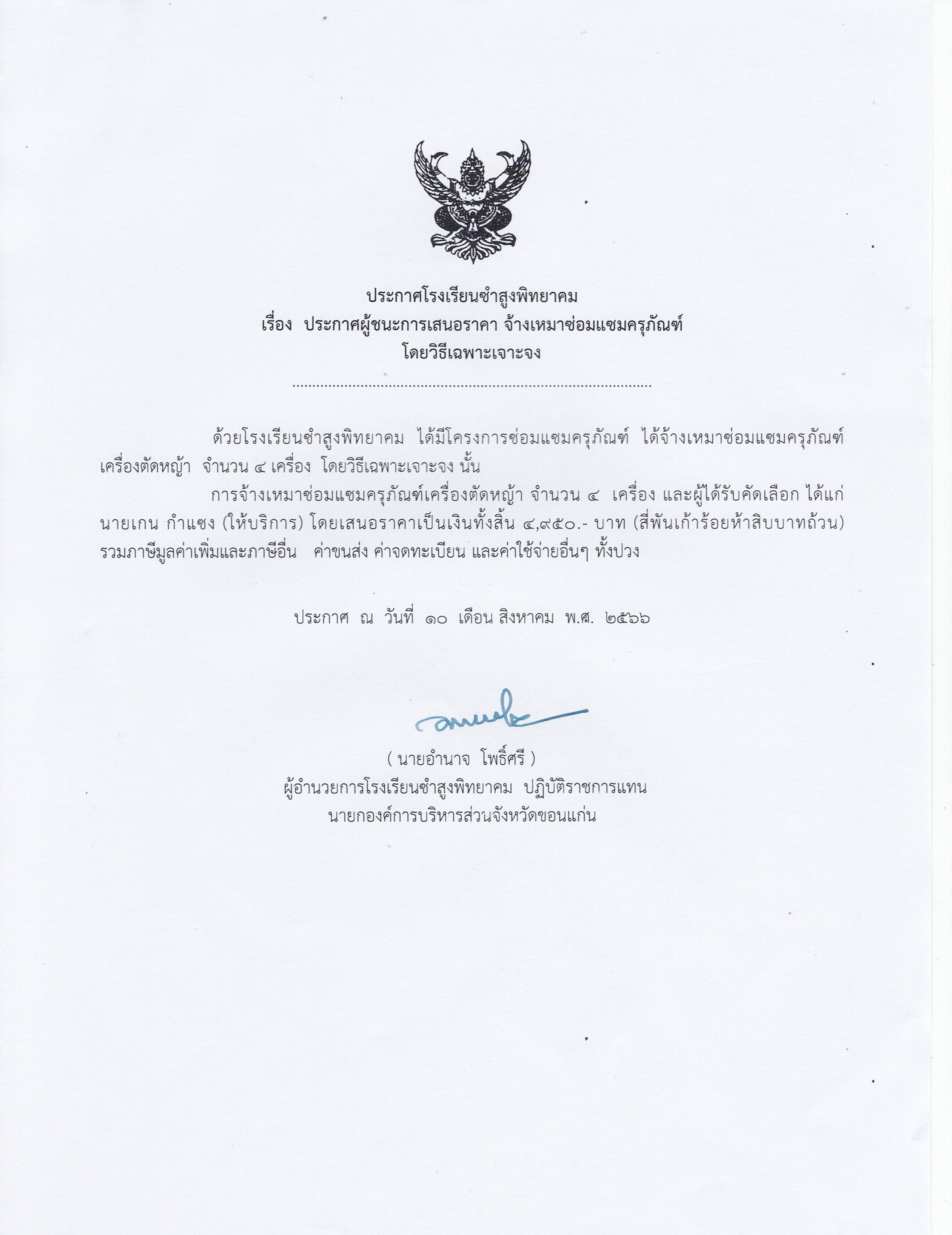 ประกาศโรงเรียนซำสูงพิทยาคมเรื่องประกาศผู้ชนะการเสนอราคาจ้างเหมาซ่อมแซมครุภัณฑ์โดยวิธีเฉพาะเจาะจง