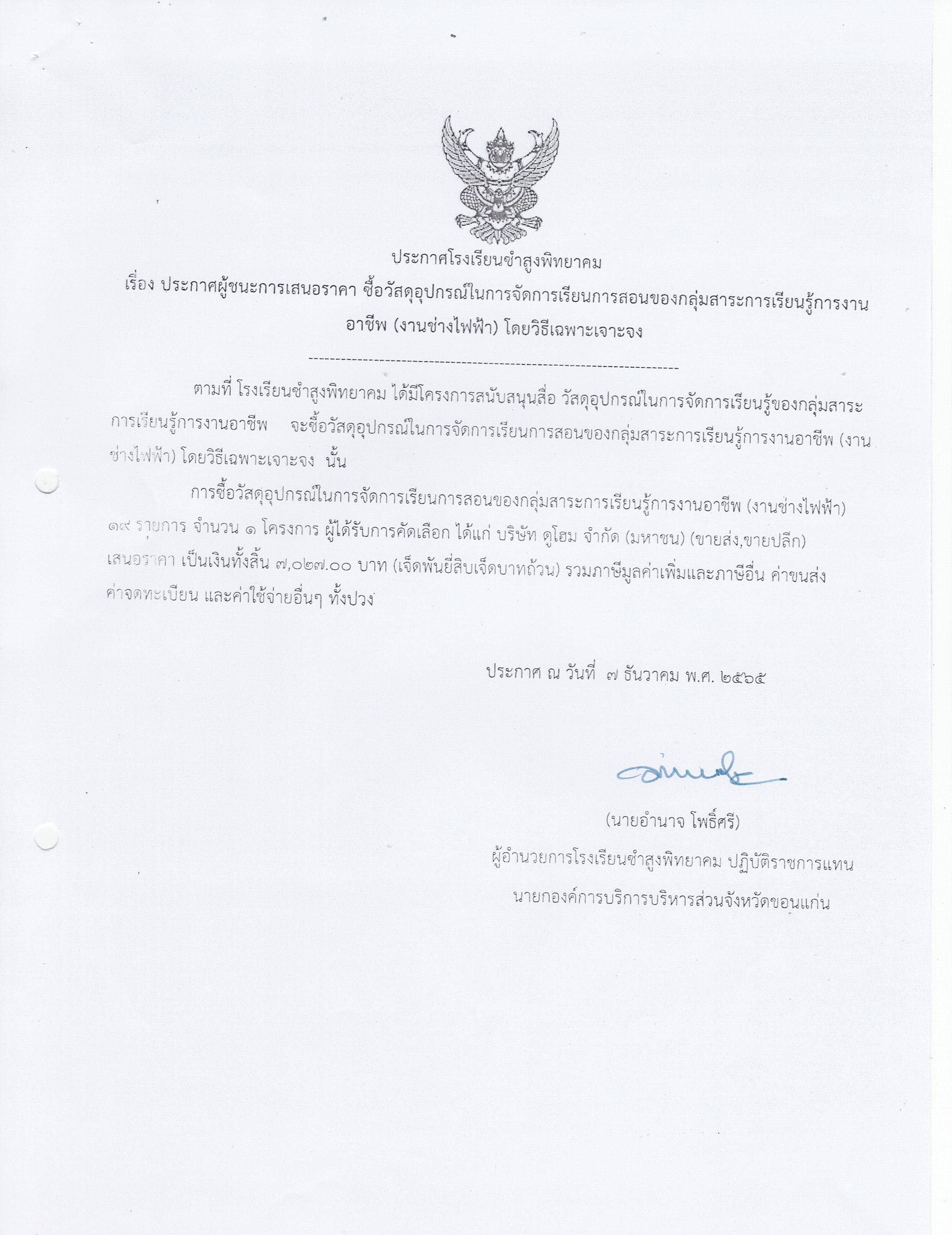 ประกาศโรงเรียนซำสูงพิทยาคมเรื่องประกาศผู้ชนะการเสนอราคาซื้อวัสดุอุปกรณ์ในการจัดการเรียนการสอนกลุ่มสาระการเรียนรู้การงานอาชีพ (งานช่างไฟฟ้า) โดยวิธีเฉพาะเจาะจง