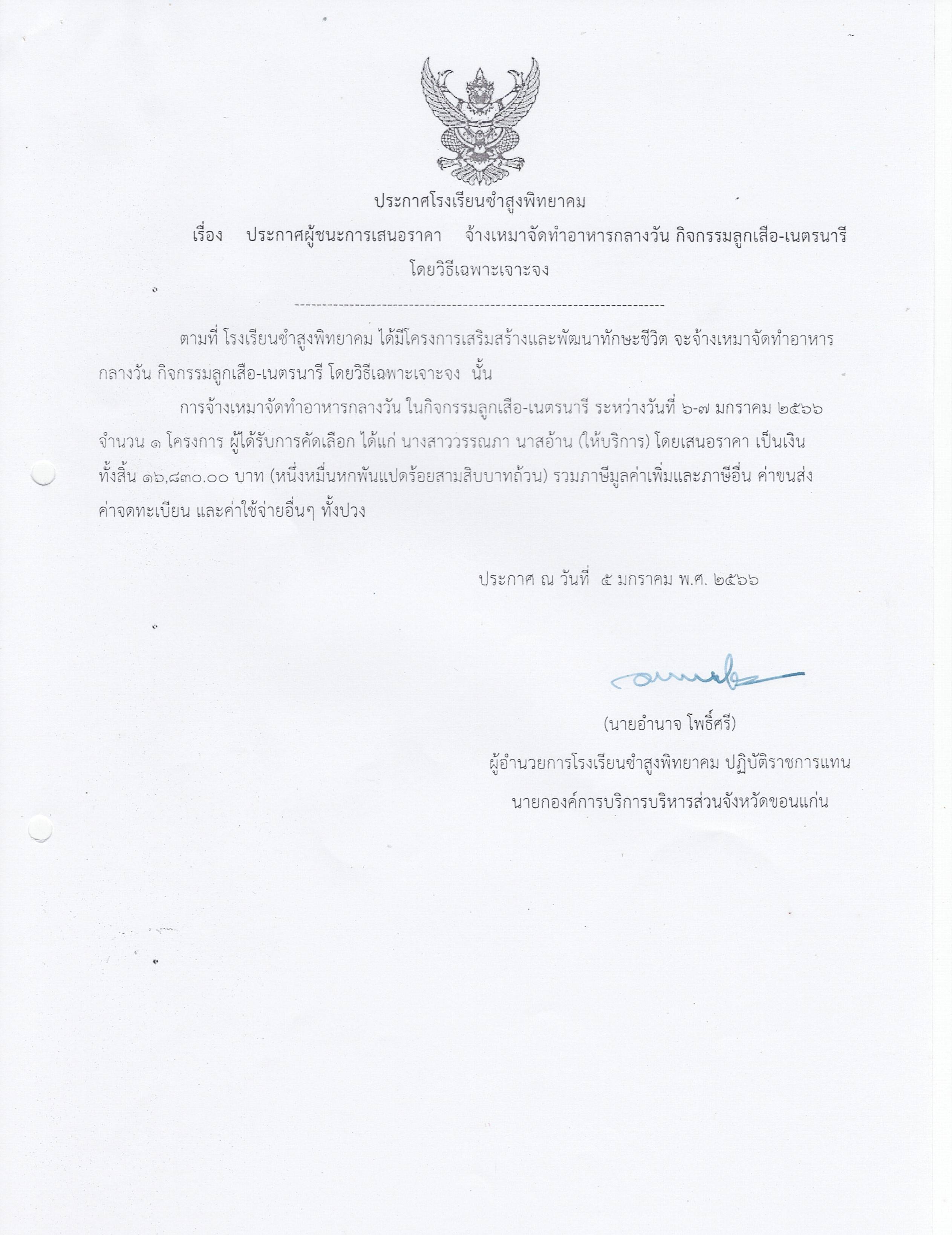 ประกาศโรงเรียนซำสูงพิทยาคม เรื่อง ประกาศผู้ชนะการเสนอราคาจ้างเหมาจัดทำอาหารกลางวันกิจกรรมลูกเสือเนตรนารีโดยวิธีเฉพาะเจาะจง
