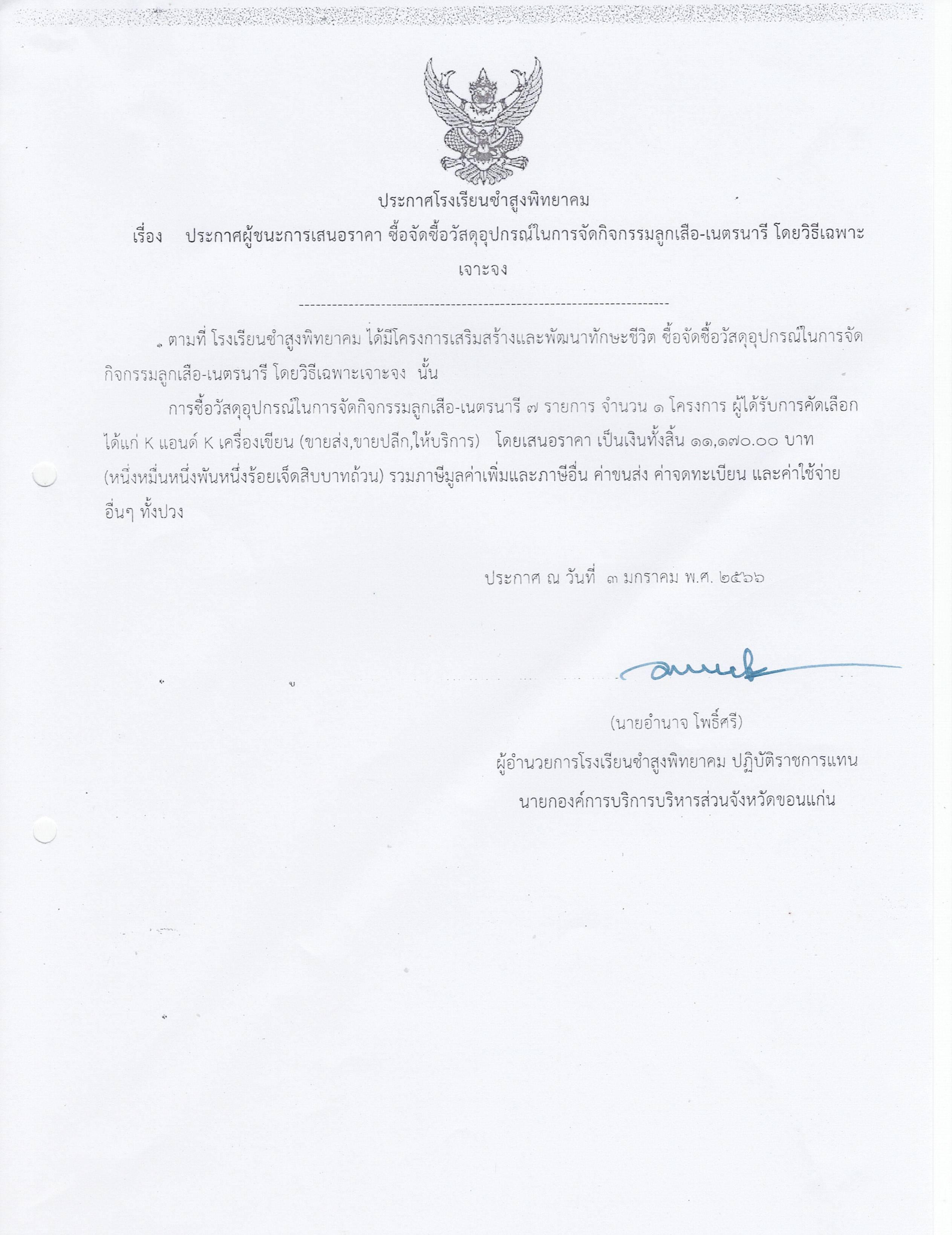 ประกาศโรงเรียนซำสูงพิทยาคมเรื่องประกาศผู้ชนะการเสนอราคาจัดซื้อวัสดุอุปกรณ์ในการจัดกิจกรรมลูกเสือเนตรนารีโดยวิธีเฉพาะเจาะจง