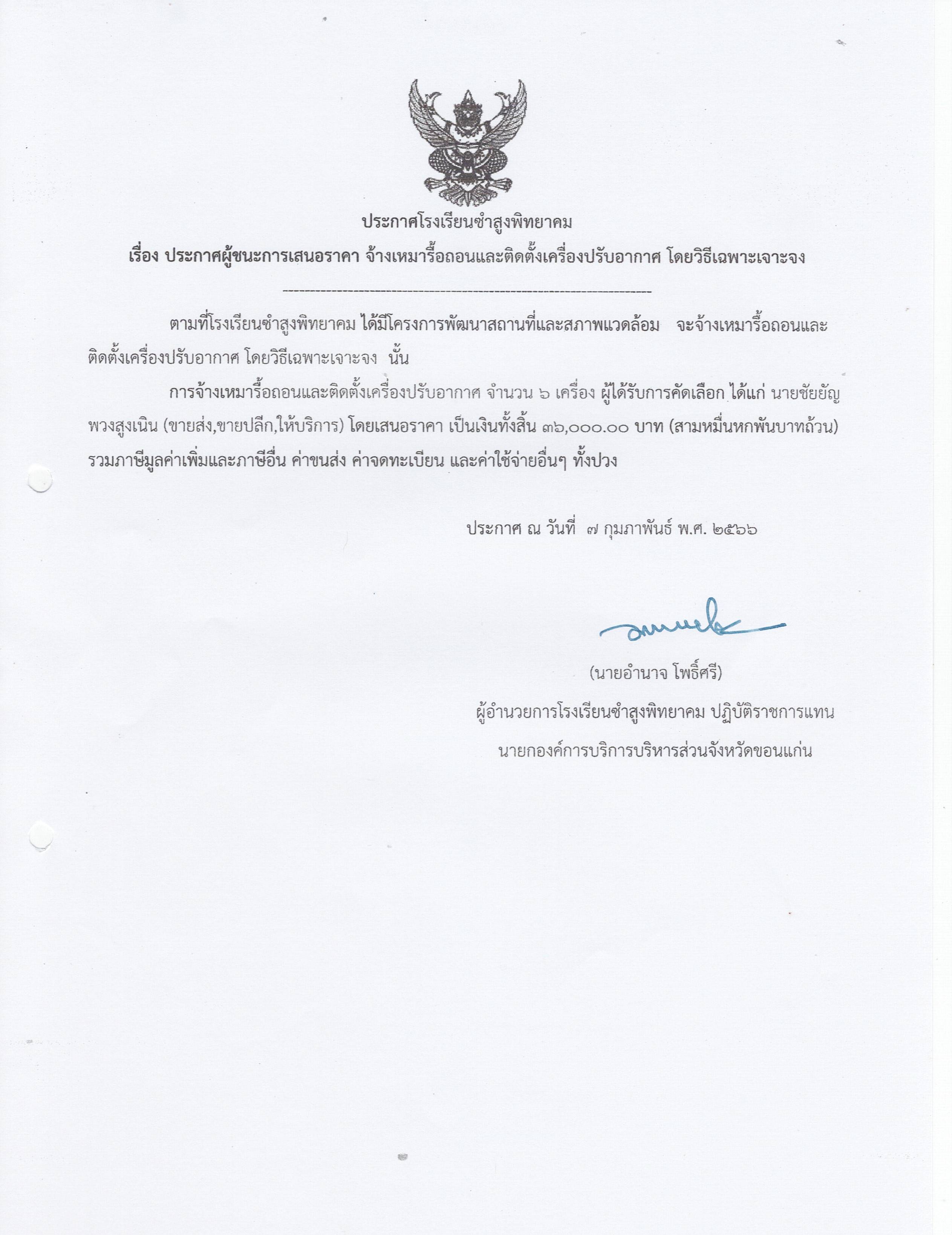 ประกาศโรงเรียนซำสูงพิทยาคมเรื่องประกาศผู้ชนะการเสนอราคาจ้างเหมารื้อถอนและติดตั้งเครื่องปรับอากาศโดยวิธีเฉพาะเจาะจง