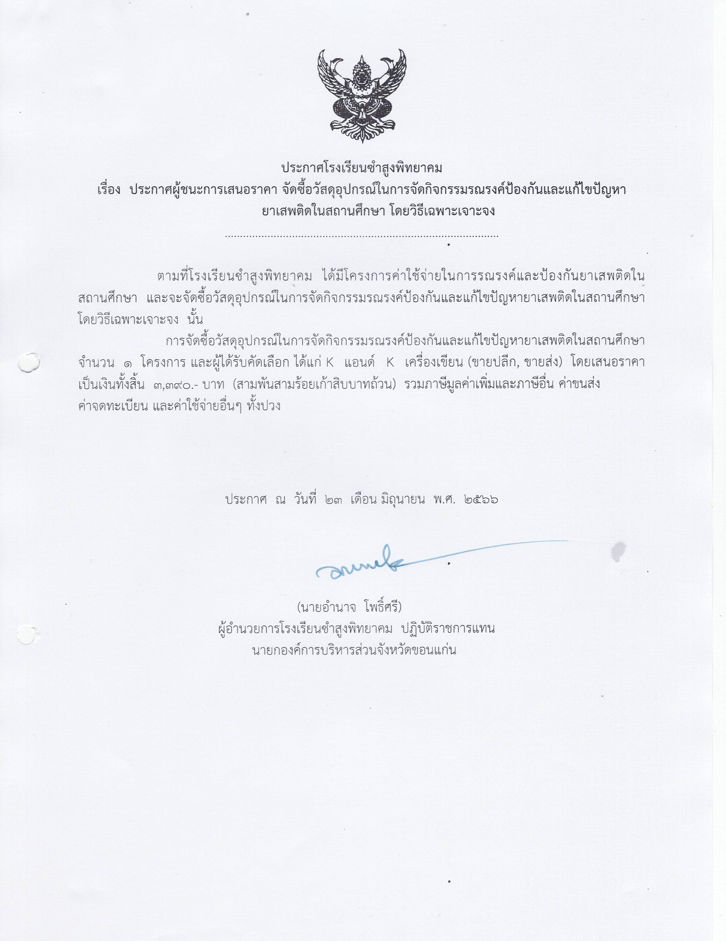 ประกาศโรงเรียนซำสูงพิทยาคมเรื่องประกาศผู้ชนะการเสนอราคาจัดซื้อวัสดุอุปกรณ์ในการจัดกิจกรรมรณรงค์ป้องกันและแก้ไขปัญหายาเสพติดในสถานศึกษา โดยวิธีเฉพาะเจาะจง