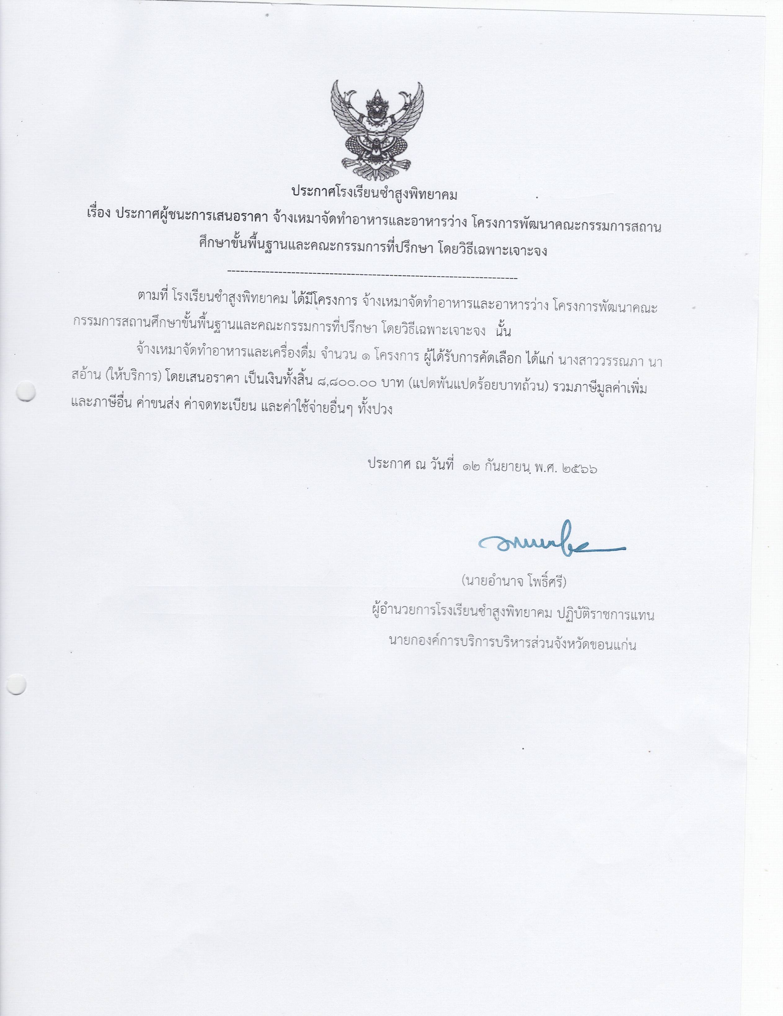 ประกาศโรงเรียนซำสูงพิทยาคม เรื่อง ประกาศผู้ชนะการเสนอราคา จ้างเหมาจัดทำอาหารและอาหารว่าง โครงการพัฒนาคณะกรรมการสถาน ศึกษาขั้นพื้นฐานและคณะกรรมการที่ปรึกษา โดยวิธีเฉพาะเจาะจง
