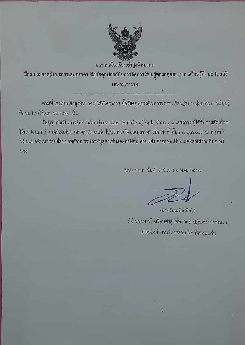ประกาศโรงเรียนซำสูงพิทยาคม เรื่อง ประกาศผู้ชนะการเสนอราคา ซื้อวัสดุอุปกรณ์ในการจัดการเรียนรู้ของกลุ่มสาระการเรียนรู้ศิลปะ โดยวิธี เฉพาะเจาะจง