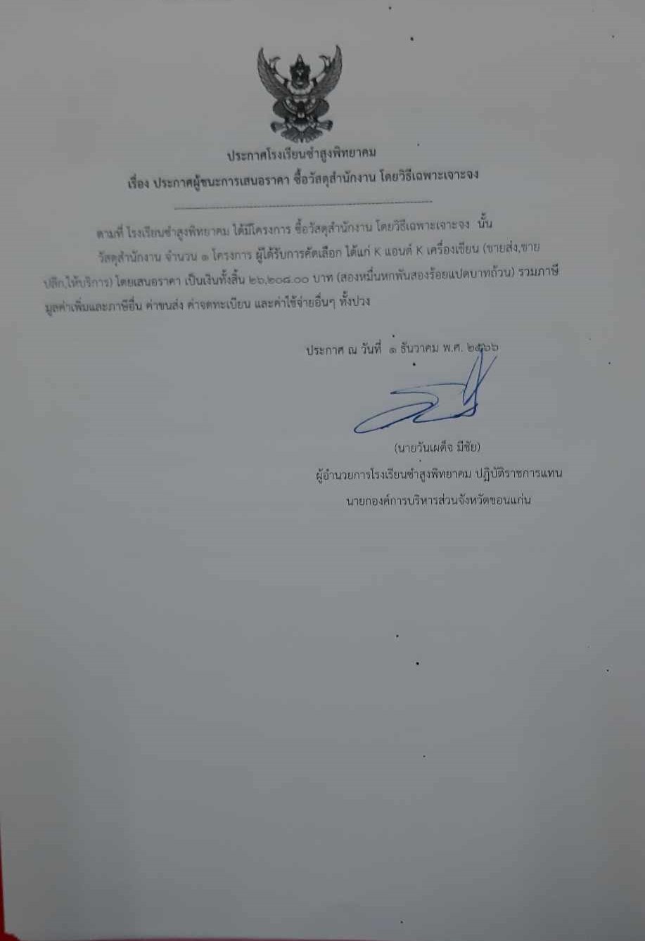 ประกาศโรงเรียนซำสูงพิทยาคม เรื่อง ประกาศผู้ชนะการเสนอราคา ซื้อวัสตุสำนักงาน โดยวิธีเฉพาะเจาะจง