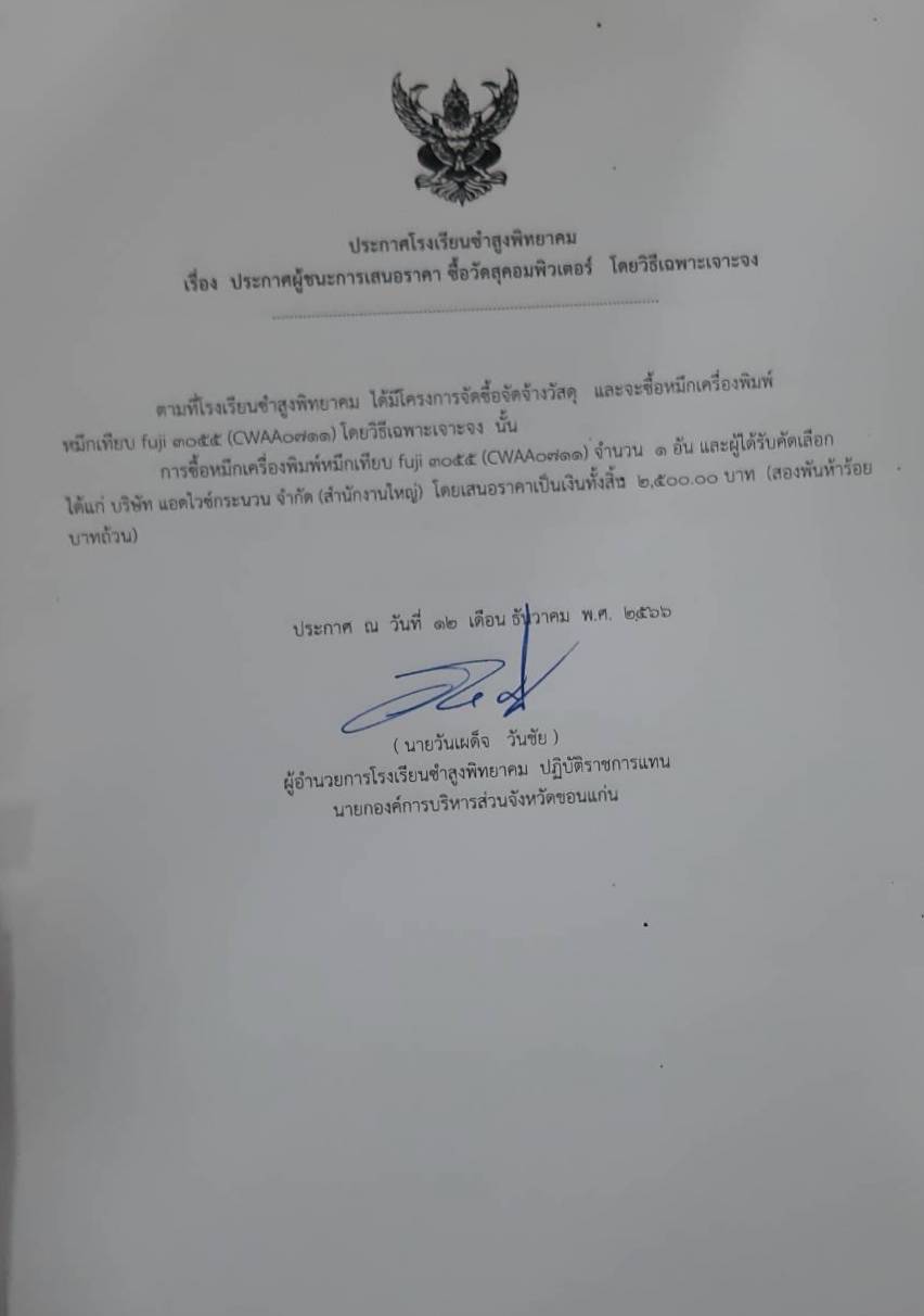 ประกาศโรงเรียนซำสูงพิทยาคม เรื่อง ประกาศผู้ชนะการเสนอราคา ซื้อวัสดุคอมพิวเตอร์ โดยวิธีเฉพาะเจาะจง