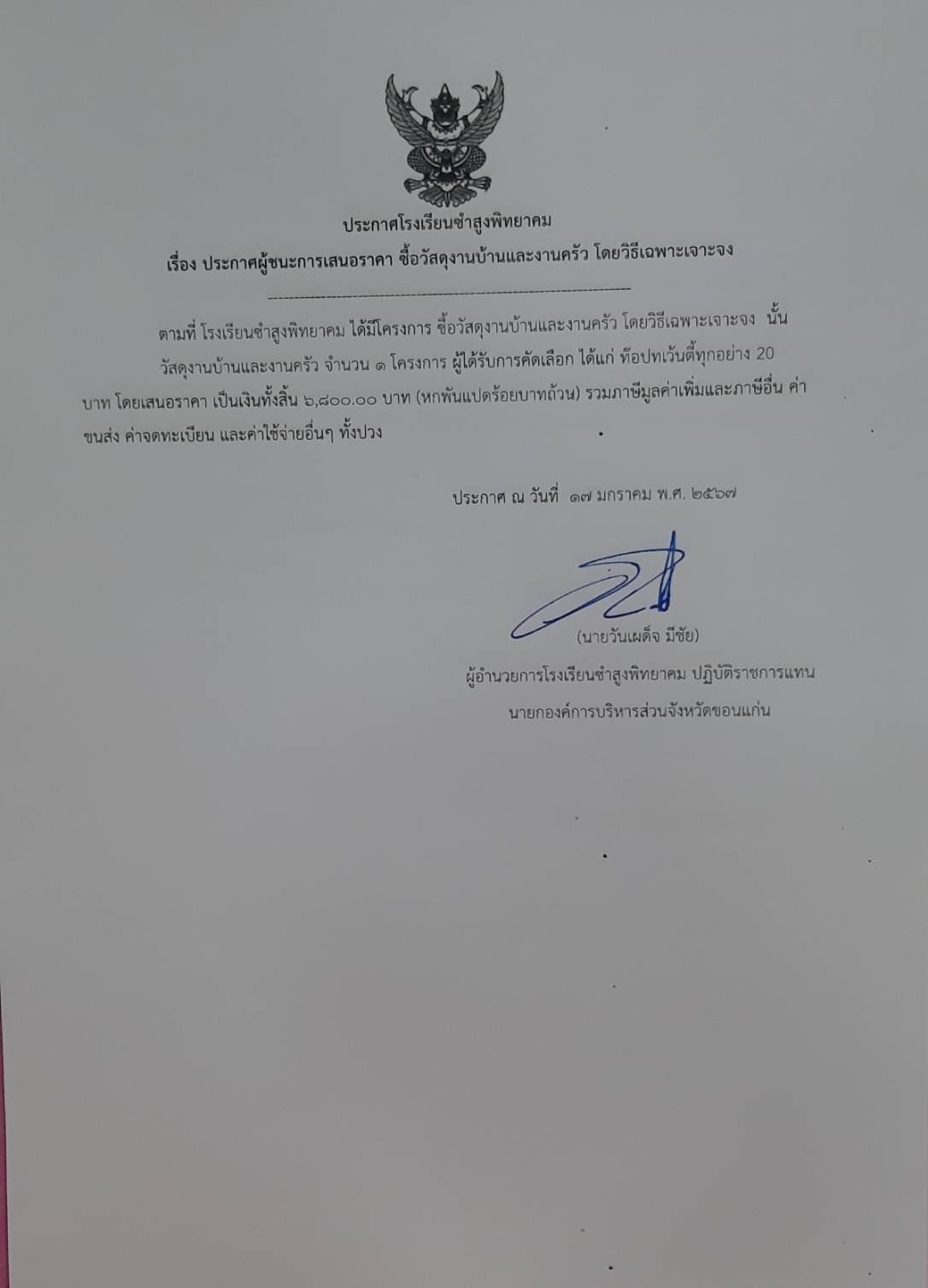 ประกาศโรงเรียนซำสูงพิทยาคม เรื่อง ประกาศผู้ชนะการเสนอราคา ซื้อวัสดุงานบ้านและงานครัว โดยวิธีเฉพาะเจาะจง