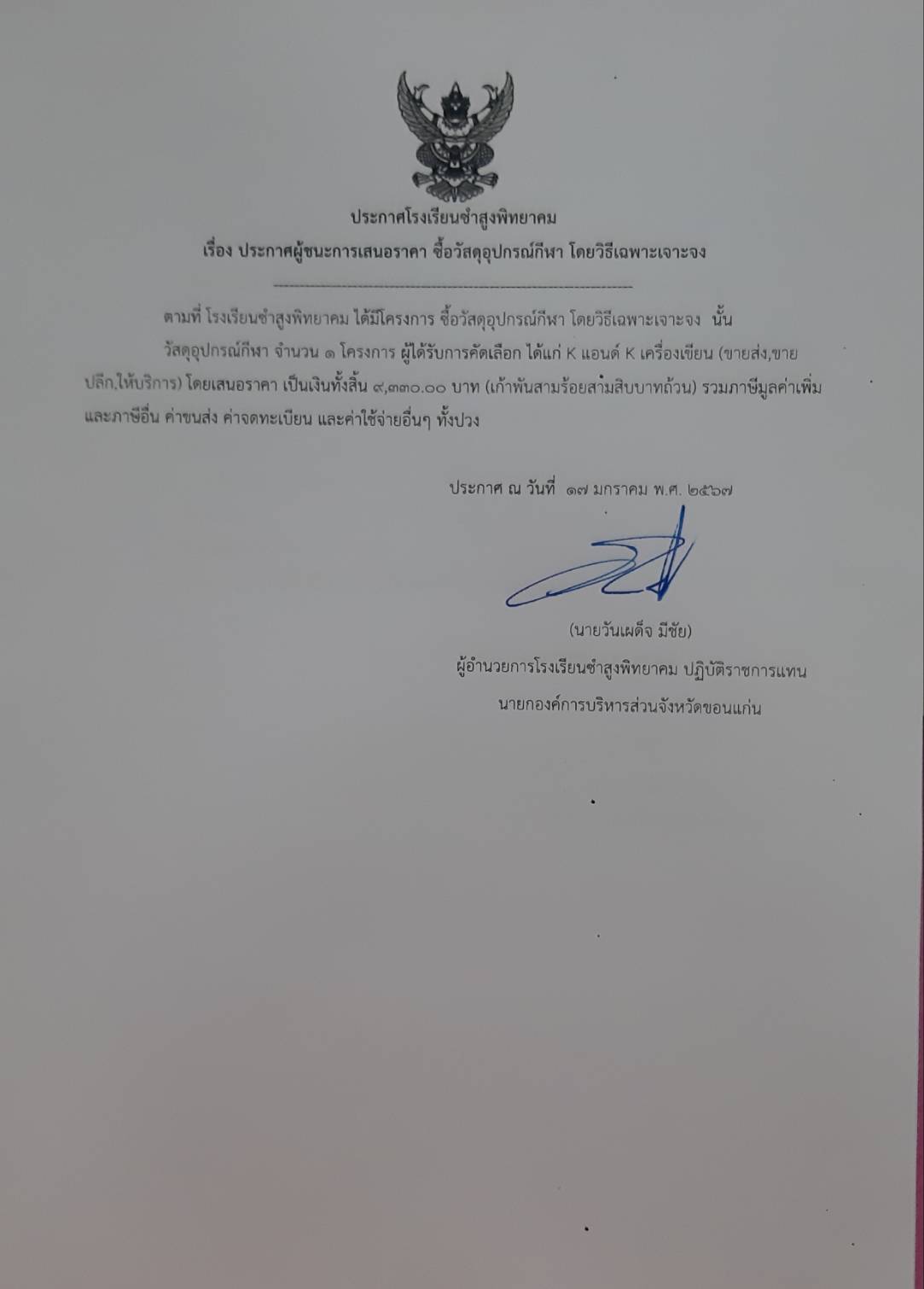 ประกาศโรงเรียนซำสูงพิทยาคม เรื่องประกาศผู้ชนะการเสนอราคา ซื้อวัสดุอุปกรณ์กีฬา โดยวิธีเฉพาะเจาะจง