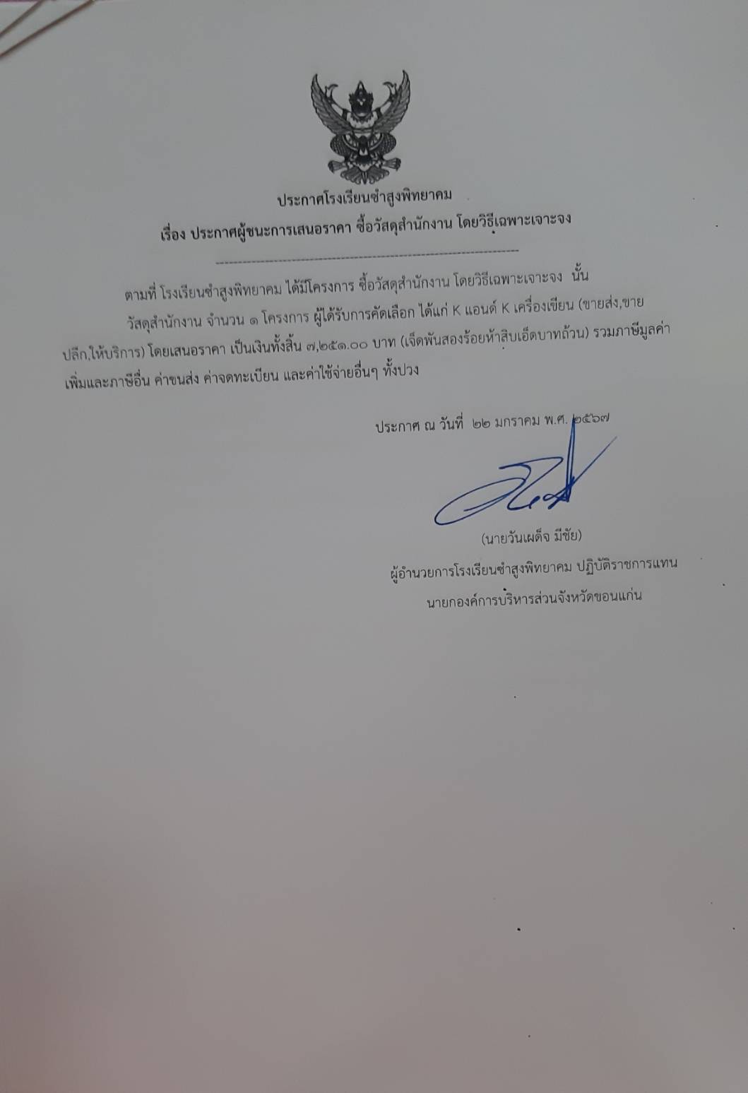 ประกาศโรงเรียนซำสูงพิทยาคม เรื่อง ประกาศผู้ชนะการเสนอราคา ซื้อวัสดุสำนักงาน โดยวิธีเฉพาะเจาะจง