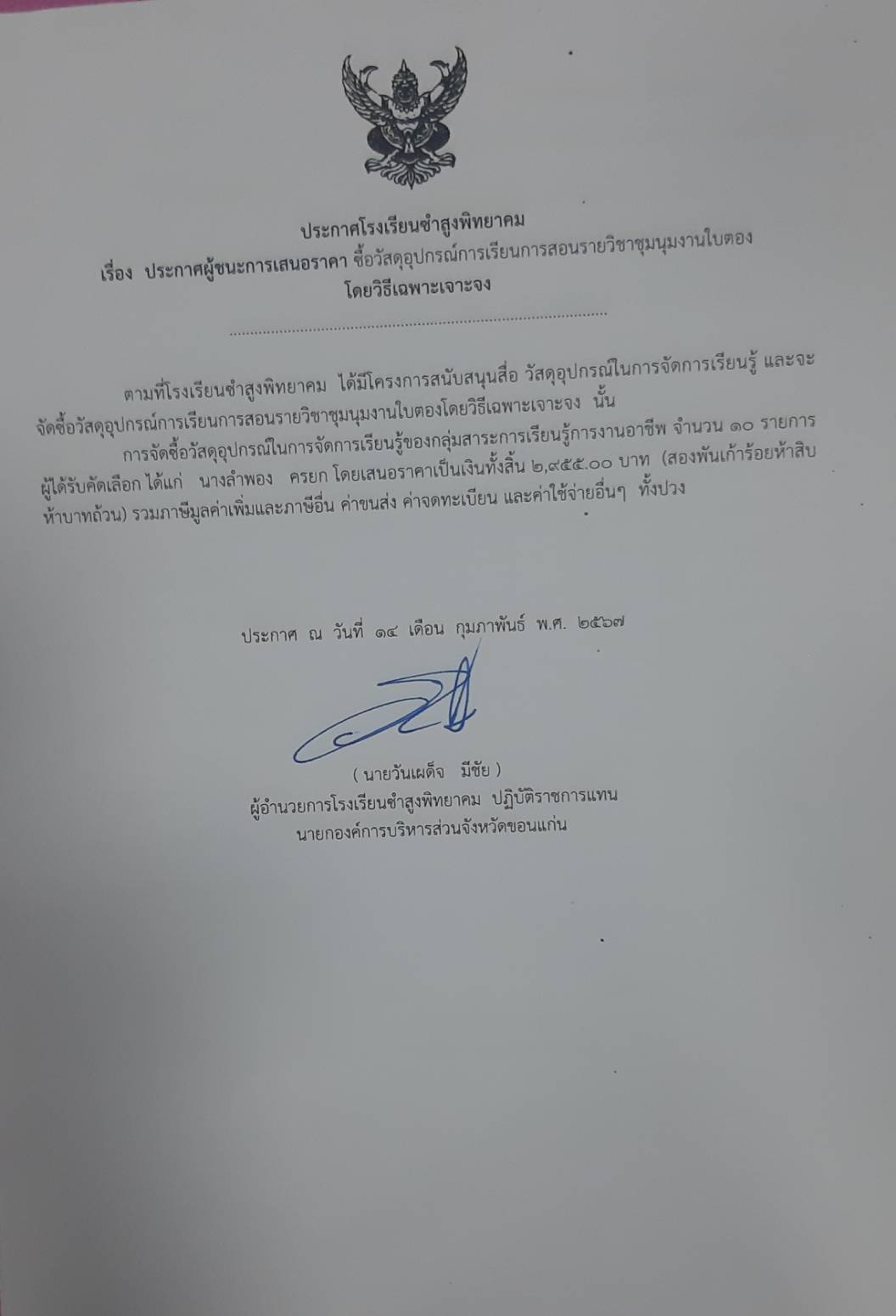 ประกาศโรงเรียนซำสูงพิทยาคม เรื่อง ประกาศผู้ชนะการเสนอราคา ซื้อวัสดุอุปกรณ์การเรียนการสอนรายวิชาชุมนุมงานใบตอง โดยวิธีเฉพาะเจาะจง